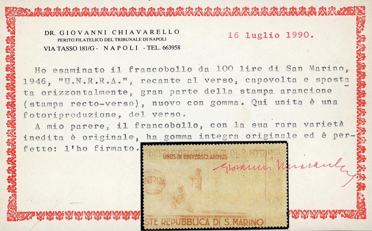 1946 - 100 lire UNRRA, stampa recto-verso del bruno arancio, capovolta al verso (296e), gomma integra, perfetto. Rarissimo! Cert. Raybaudi e Chiavarello.