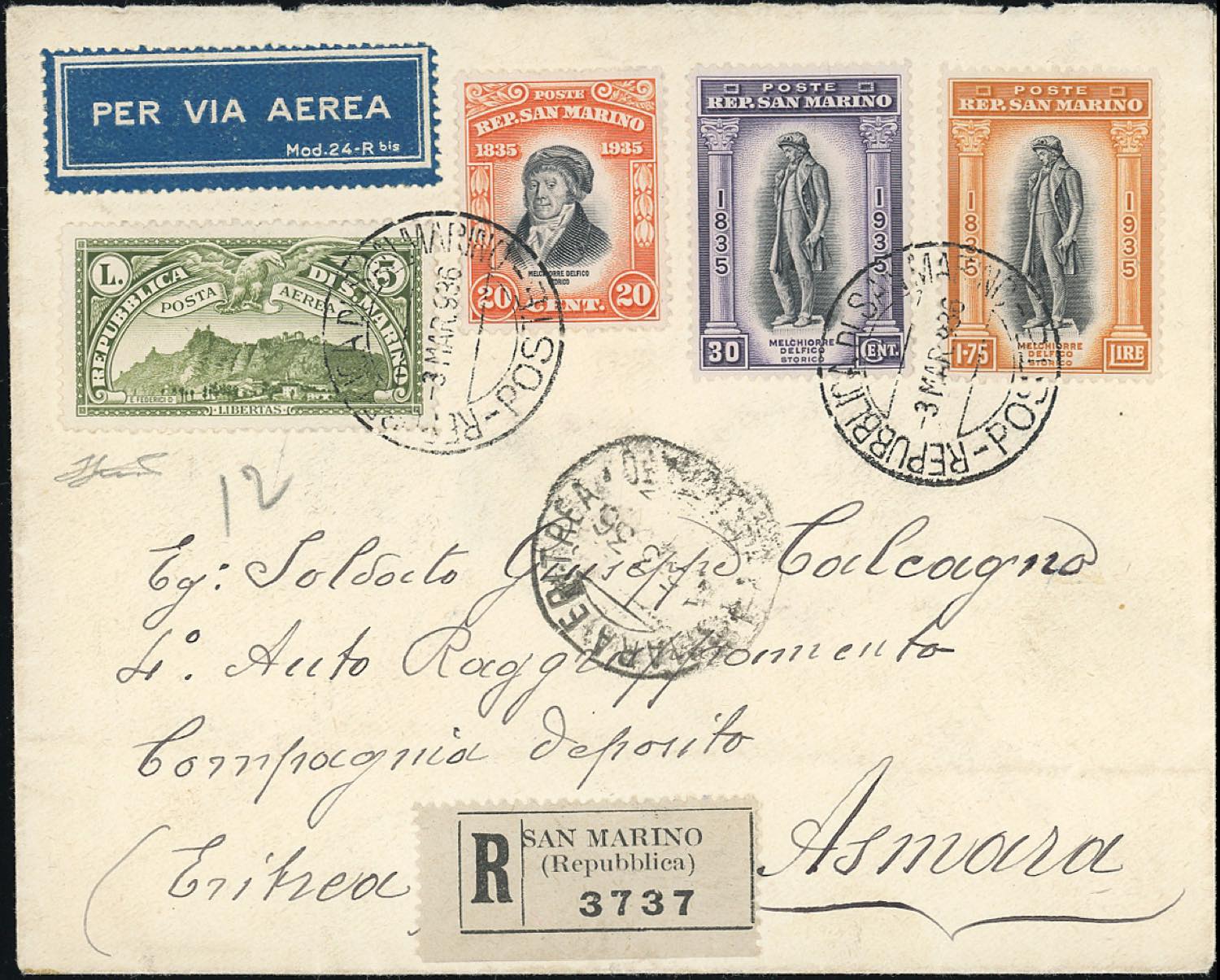 1936 - Veduta, serie completa (1/10), con complementari della serie Delfico, perfetti, su otto aerogrammi, sei dei quali raccomandati, spediti da San Marino nel febbraio/marzo 1936 ad Asmara o a Cagliari. Raro insieme. Ferrario, cert. E.Diena.