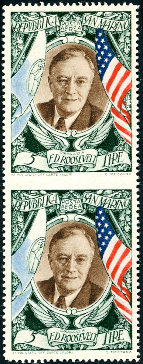 Lotto 2133 - 1947 - 5 lire Roosvelt, coppia verticale non dentellata al ...