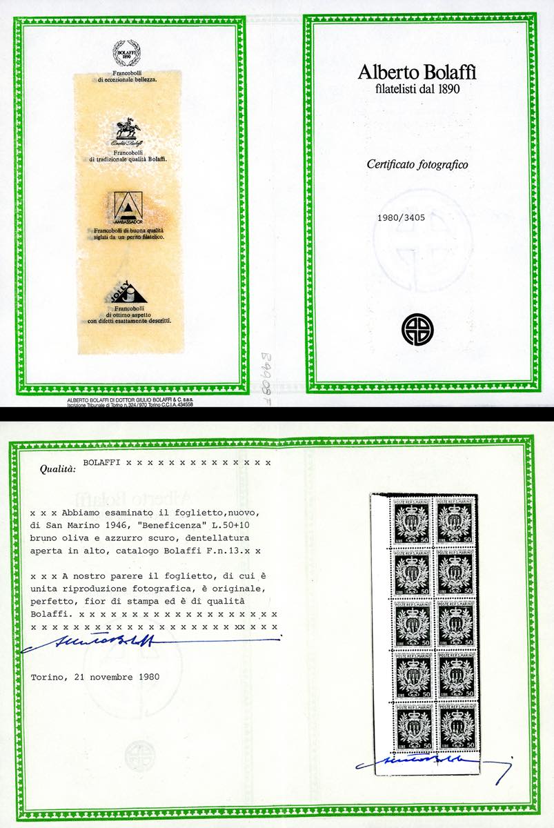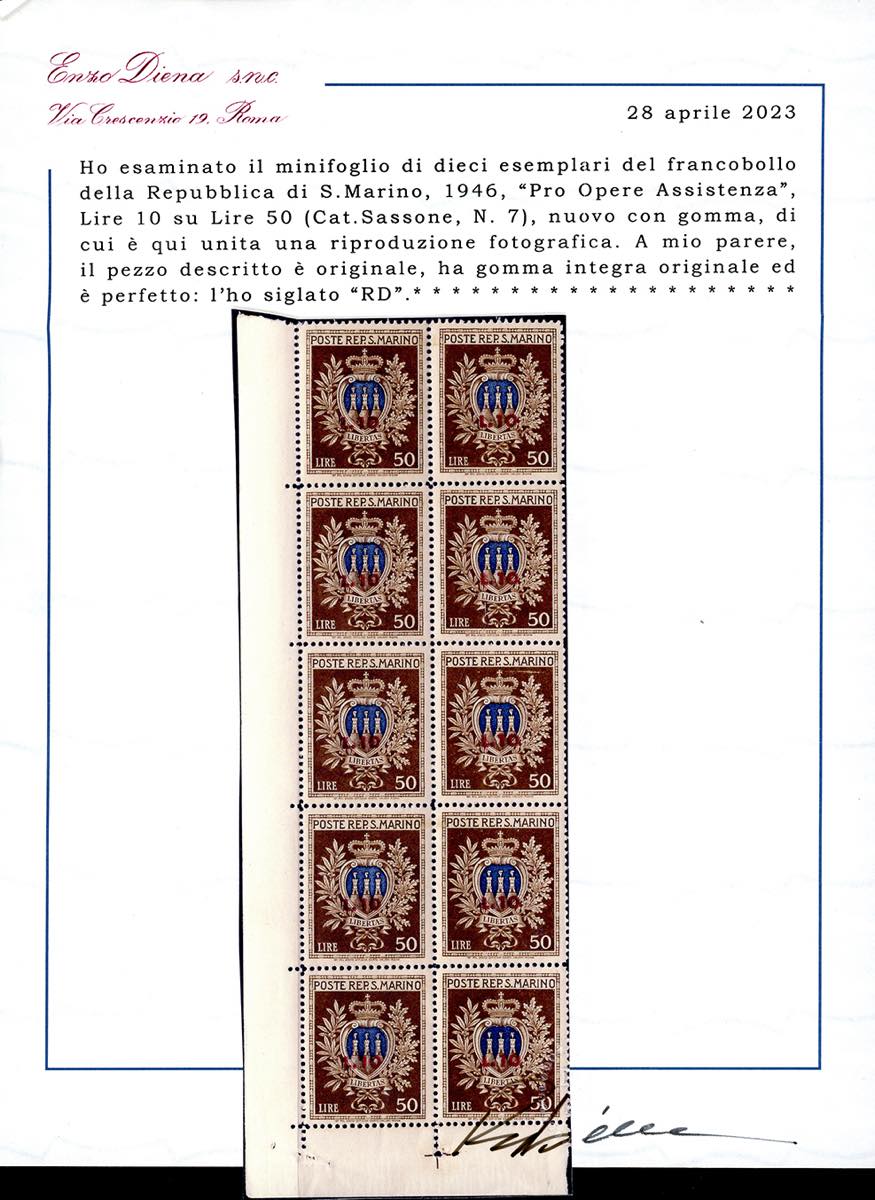 1946 - 10 lire su 50 lire Pro Opere Assistenza, soprastampato, minifoglio (7), nuovo, gomma originale integra, perfetto e non piegato. Molto fresco. Ferrario, cert. Diena e Bolaffi.