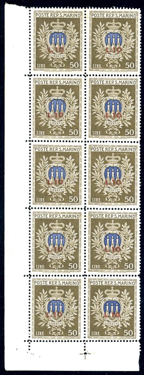 1946 - 10 lire su 50 lire Pro Opere Assistenza, soprastampato, minifoglio (7), nuovo, gomma originale integra, perfetto e non piegato. ... Leggi tutto