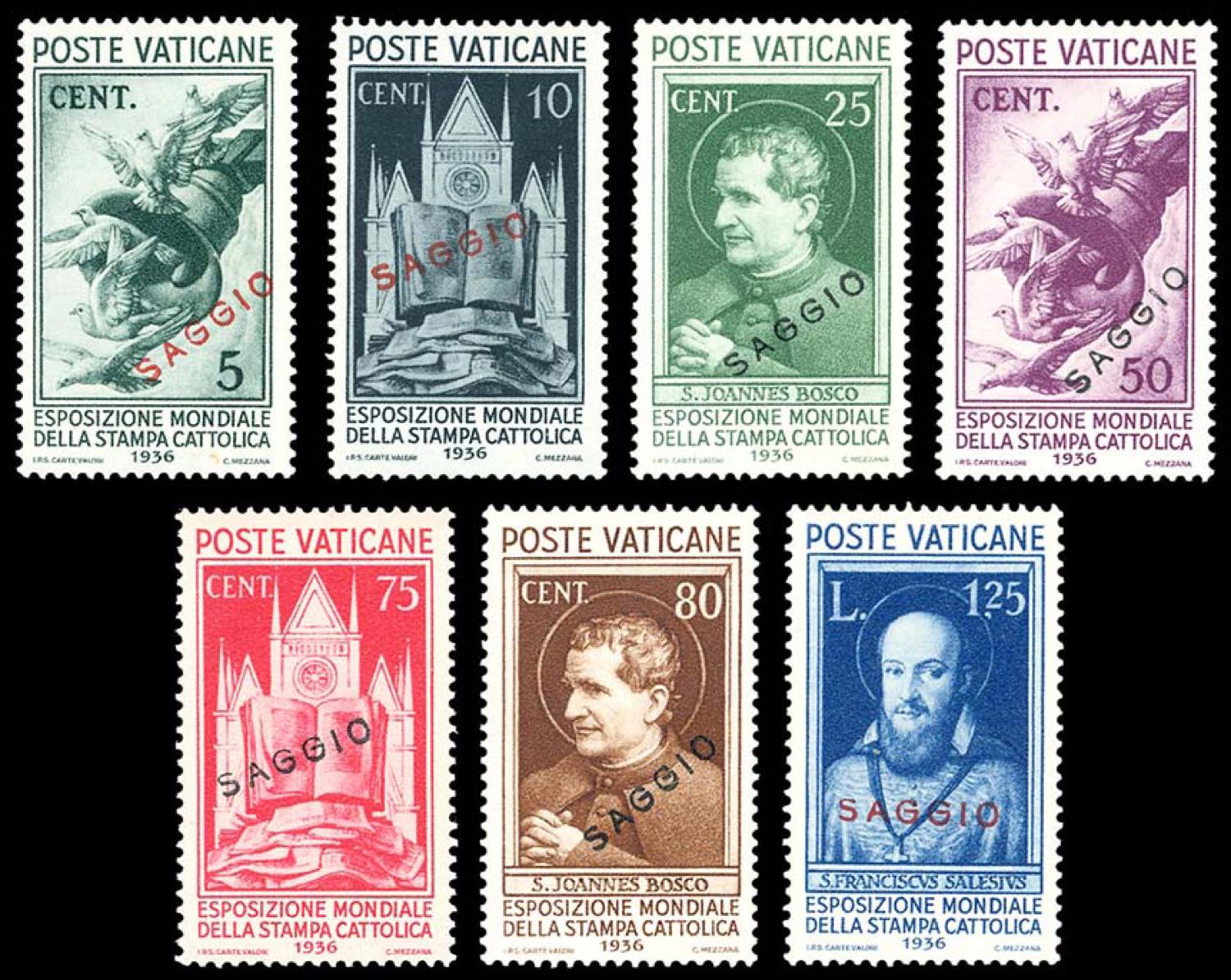1936 - Stampa Cattolica, sette valori con soprastampa SAGGIO in diagonale (47/53), gomma originale integra, perfetti. Belli e rari. Cert. Ferrario.