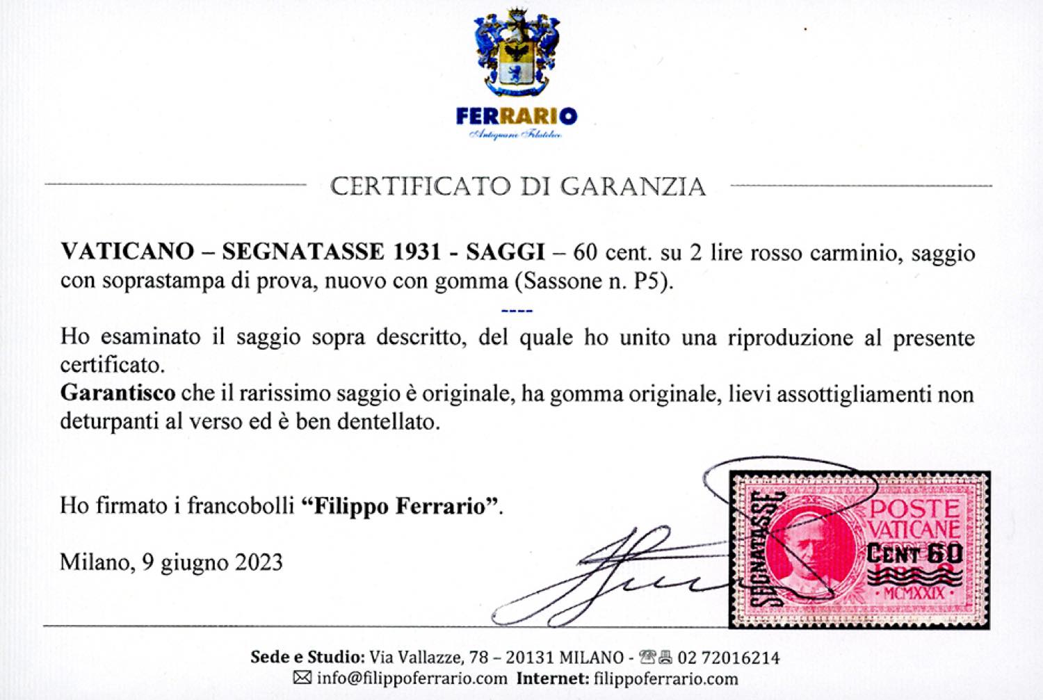 SEGNATASSE SAGGI 1931 - 60 cent. su 2 lire rosso carminio, SOPRASTAMPA DI PROVA (P5), nuovo, gomma originale, lievi assottigliamenti non deturpanti al verso, ben dentellato. Esemplare rarissimo di cui si conoscono solo pochi esemplari. Cert. Ferrario. La quotazione di catalogo indicata è per francobolli difettosi.