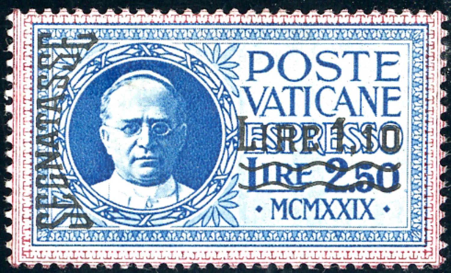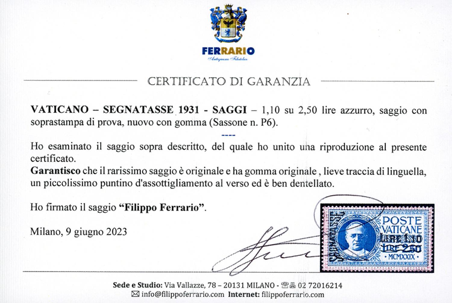 SEGNATASSE SAGGI 1931 - 1,10 su 2,50 lire azzurro, SOPRASTAMPA DI PROVA (P6), nuovo, gomma originale, lieve traccia di linguella, piccolissimo puntino d'assottigliamento al verso, ben dentellato. Esemplare rarissimo di cui si conoscono solo pochi esemplari. Cert. Ferrario. La quotazione di catalogo indicata è per esemplari difettosi.