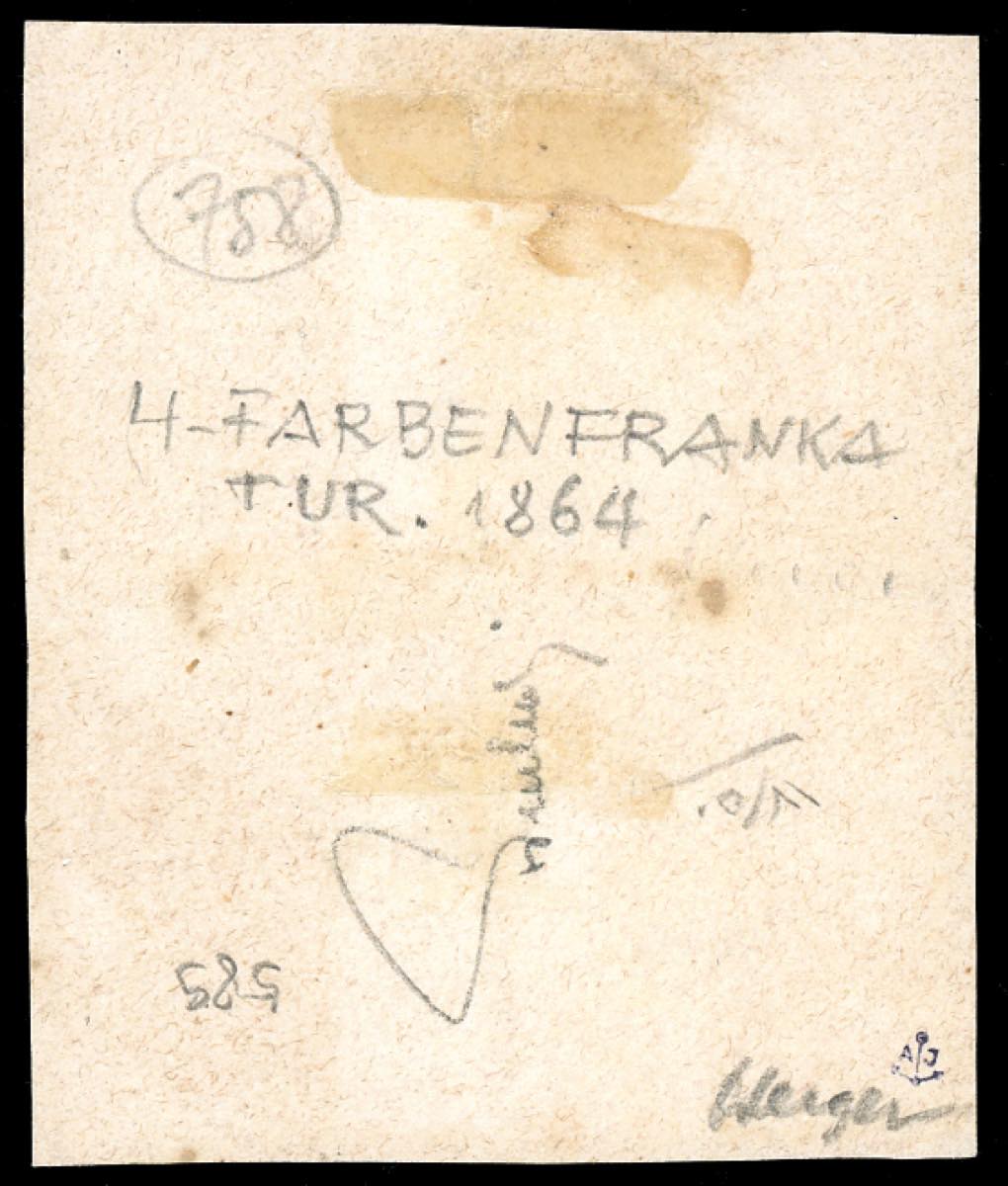 AUSTRIA 1864 - 2 kr., 3 kr., 5 kr. e 10 kr. (Cert. Ferchenbauer 30b+31a+32a+33a), perfetti, usati su frammento a Praga. Bella e rara affrancatura quadricolore, ex coll. Jerger. Cert. Ferchenbauer.
