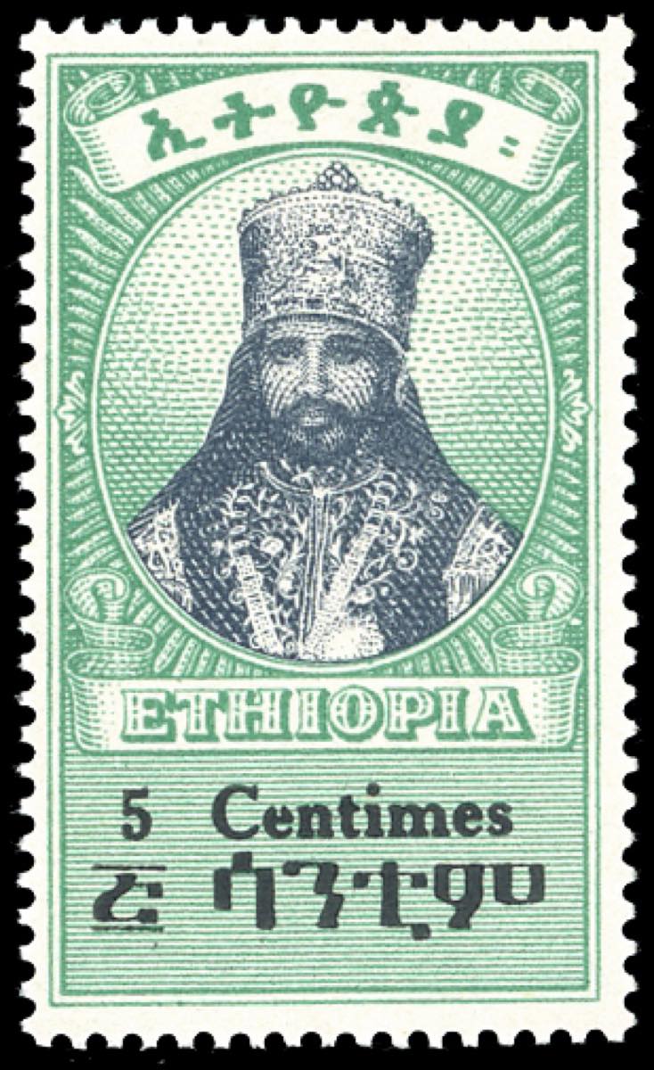 ETIOPIA 1942 - 5 cent. Haile Selassie, soprastampa invertita, amarico sotto il francese, prova di valore non adottato, sostituito dal francobollo da 4 cent., gomma originale integra MNH, perfetto. Raro e di ottima qualità. Holcombe.