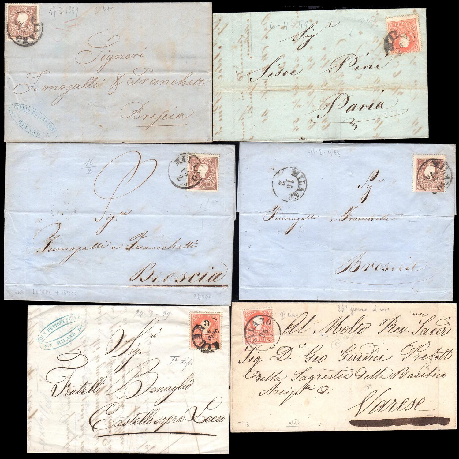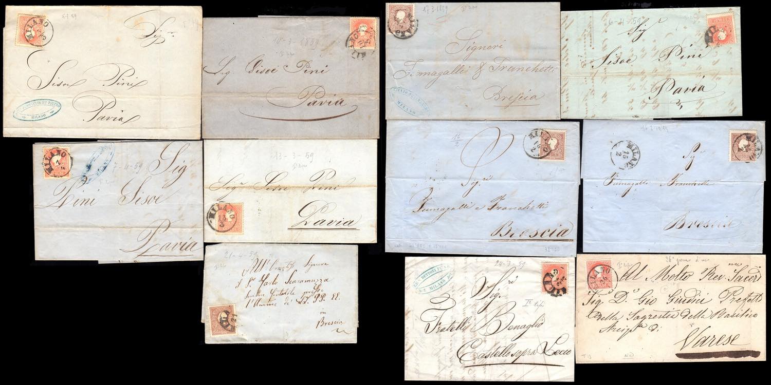 LOMBARDO VENETO 1858/1859 - Sette lettere affrancate con 5 soldi e quattro lettere con 10 soldi, tutti del I tipo (25,26), ottima qualità.