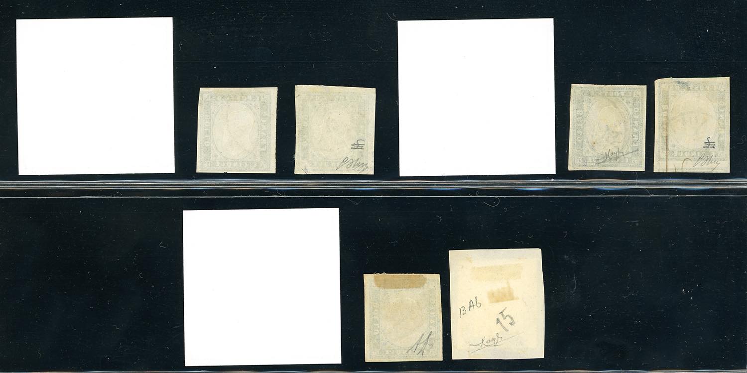 SARDEGNA 1857/1858 - 5 cent. verde mirto, sei esemplari di diverse tinte (13A,13Aa,13Ab), tutti usati o su frammento, di ottimo aspetto. Quasi tutti firmati da noti periti. Alto valore di catalogo.