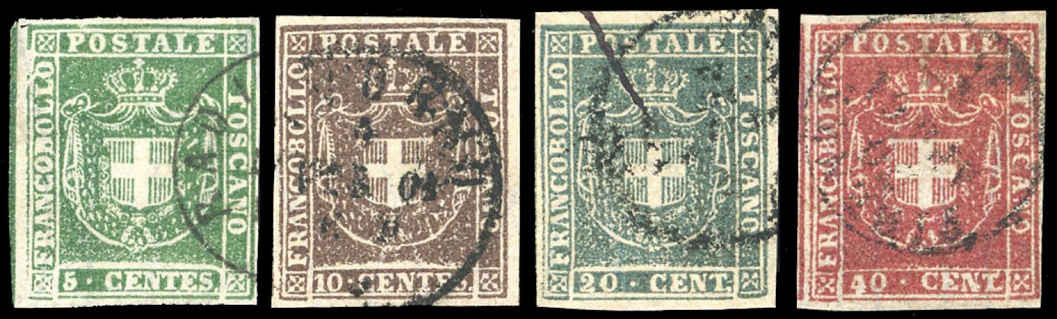 TOSCANA GOVERNO PROVVISORIO 1860 - Quattro esemplari dell'emissione usati, tutti perfetti. Notato 5 cent. con linea di riquadro verticale a sinistra. Qualità lusso, firmati Ferrario.