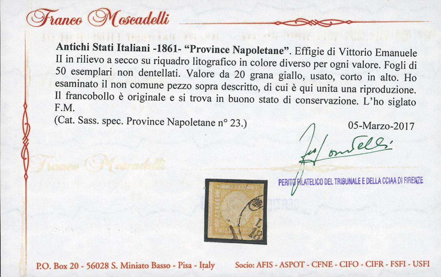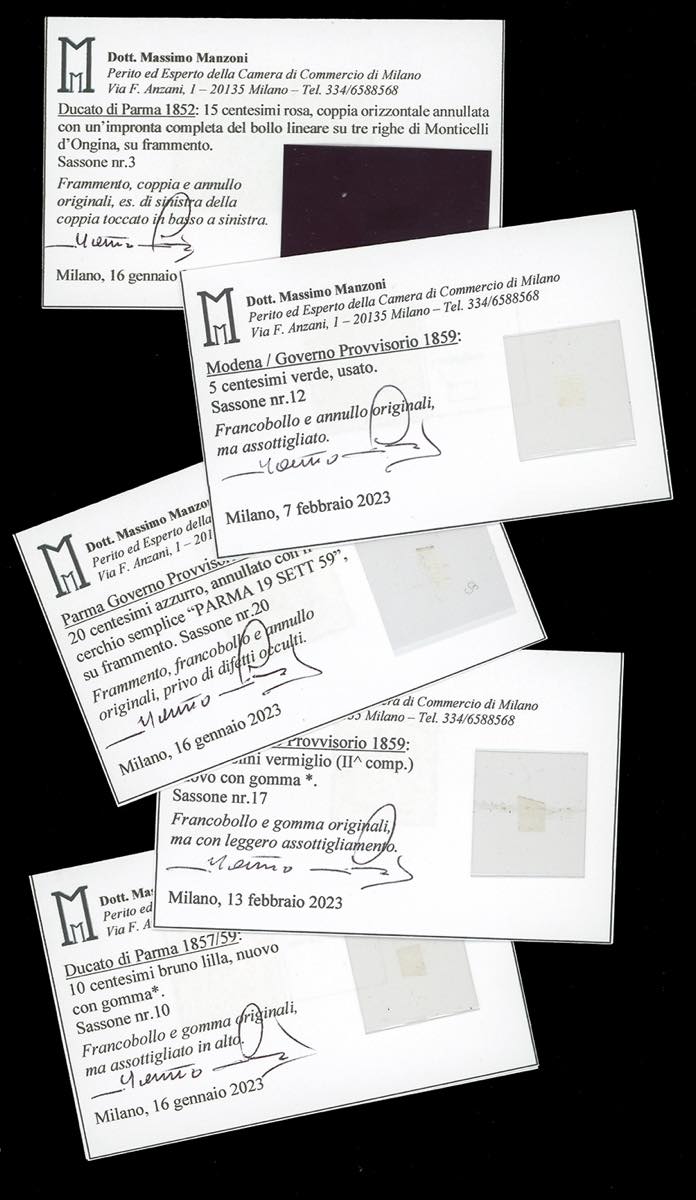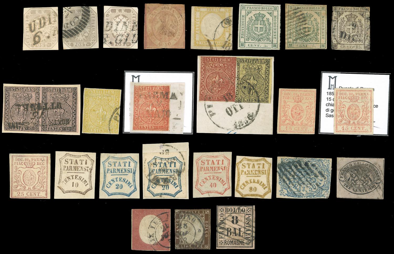 ANTICHI STATI ITALIANI 1852/1859 - Bell'insieme di francobolli medi e rari degli Antichi Stati Italiani, nuovi e usati, in parte difettosi, in parte perfetti, quasi tutti con certificati o attestazioni peritali. Elevatissimo valore di catalogo, base simbolica. Ottimo per dettaglio.