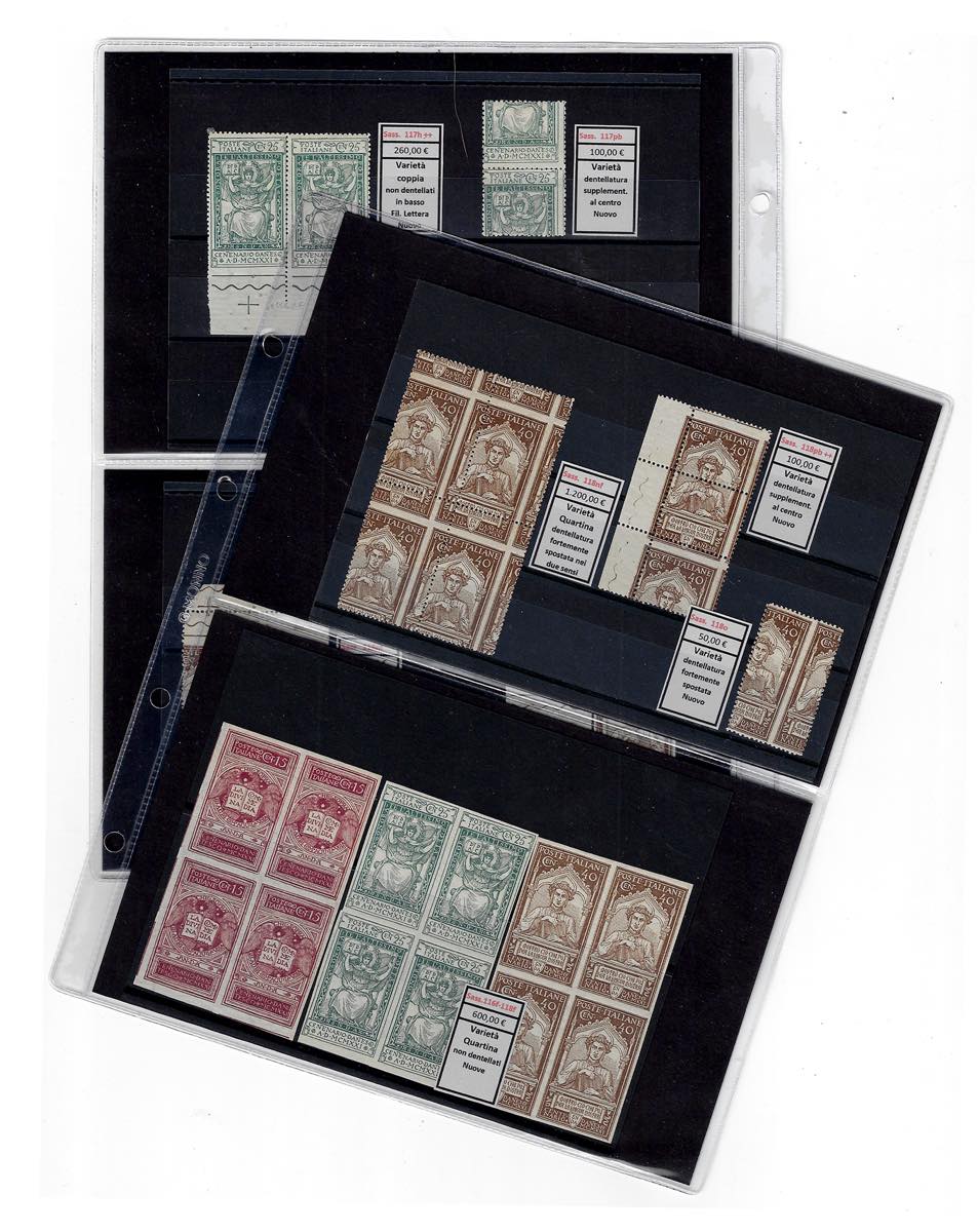REGNO D'ITALIA 1921 - Dante (116/118), bell'insieme di francobolli dell'emissione, per lo più con varietà, anche di pregio, gomma originale/integra, perfetti e di ottima qualità.