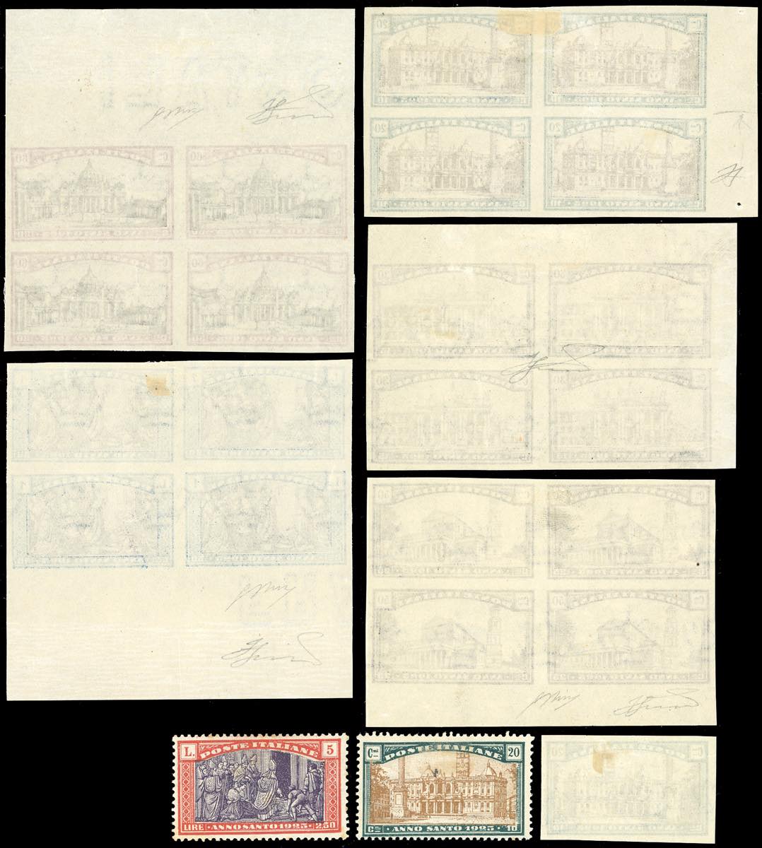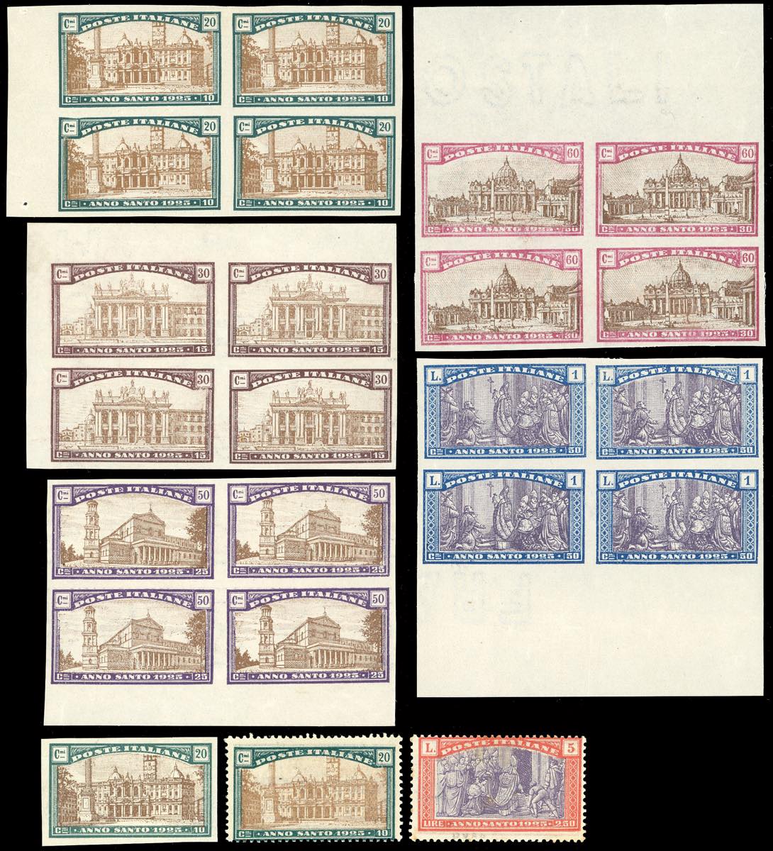 REGNO D'ITALIA 1924 - Anno Santo, i primi 5 valori della serie non dentellati (169c/173c), in blocchi di quattro, gomma originale, integra per i due esemplari inferiori, perfetti e molto freschi. G.Oliva/Ferrario. Unite altre tre varietà della serie.
