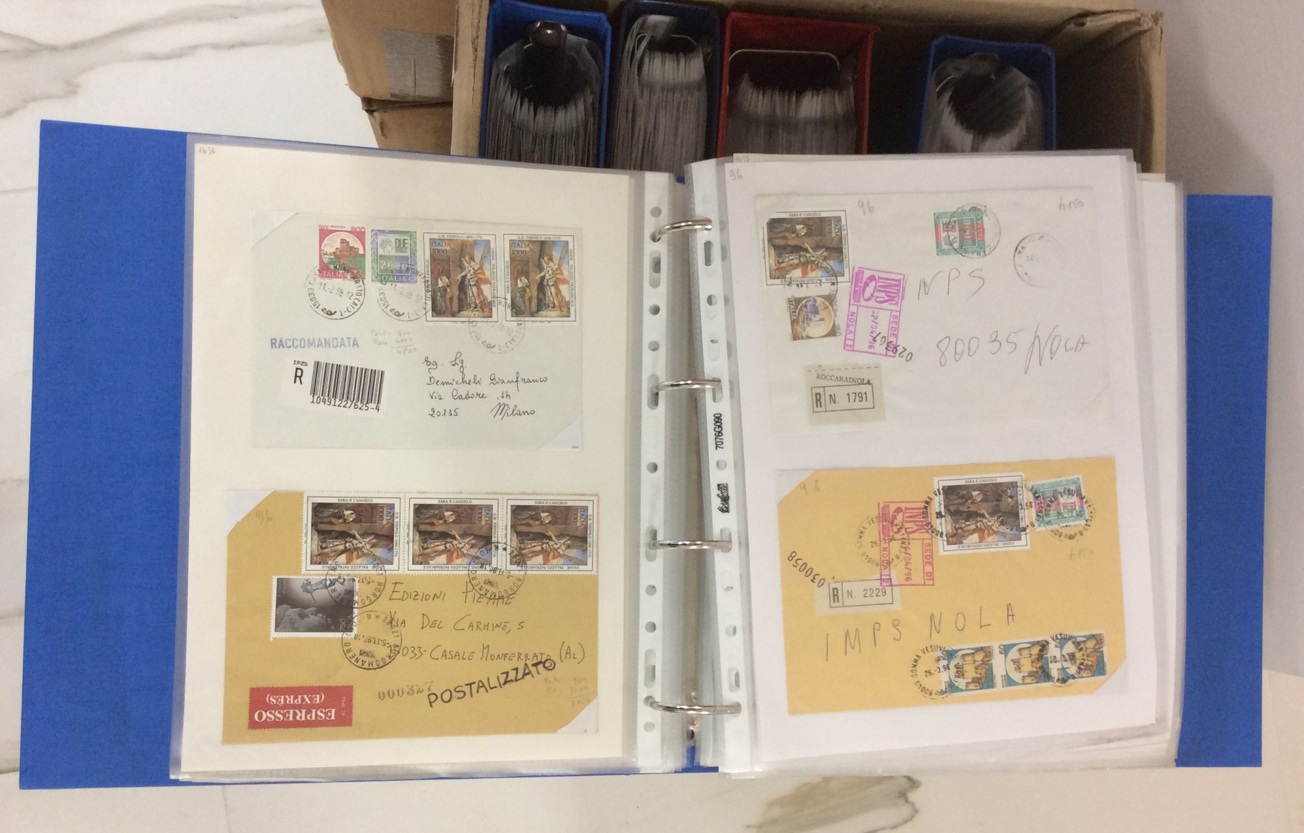 REPUBBLICA ITALIANA STORIA POSTALE 1990/1999 - Enorme collezione formata da diverse centinaia di buste affrancate con francobolli commemorativi, in 32 grandi raccoglitori, in 5 scatoloni. Notate varietà di usi, tariffe e combinazioni multiple anche rare. Per specialista, ottimo anche per dettaglio.
