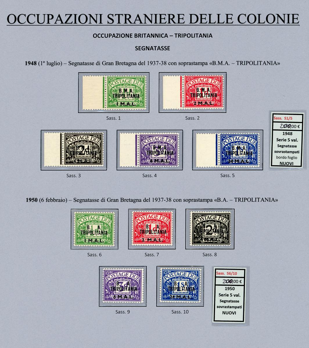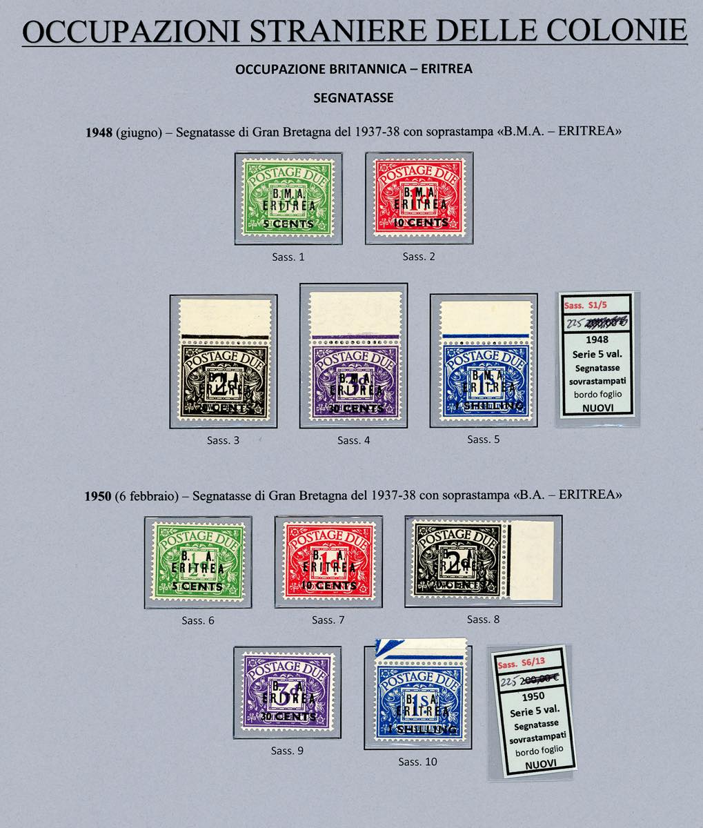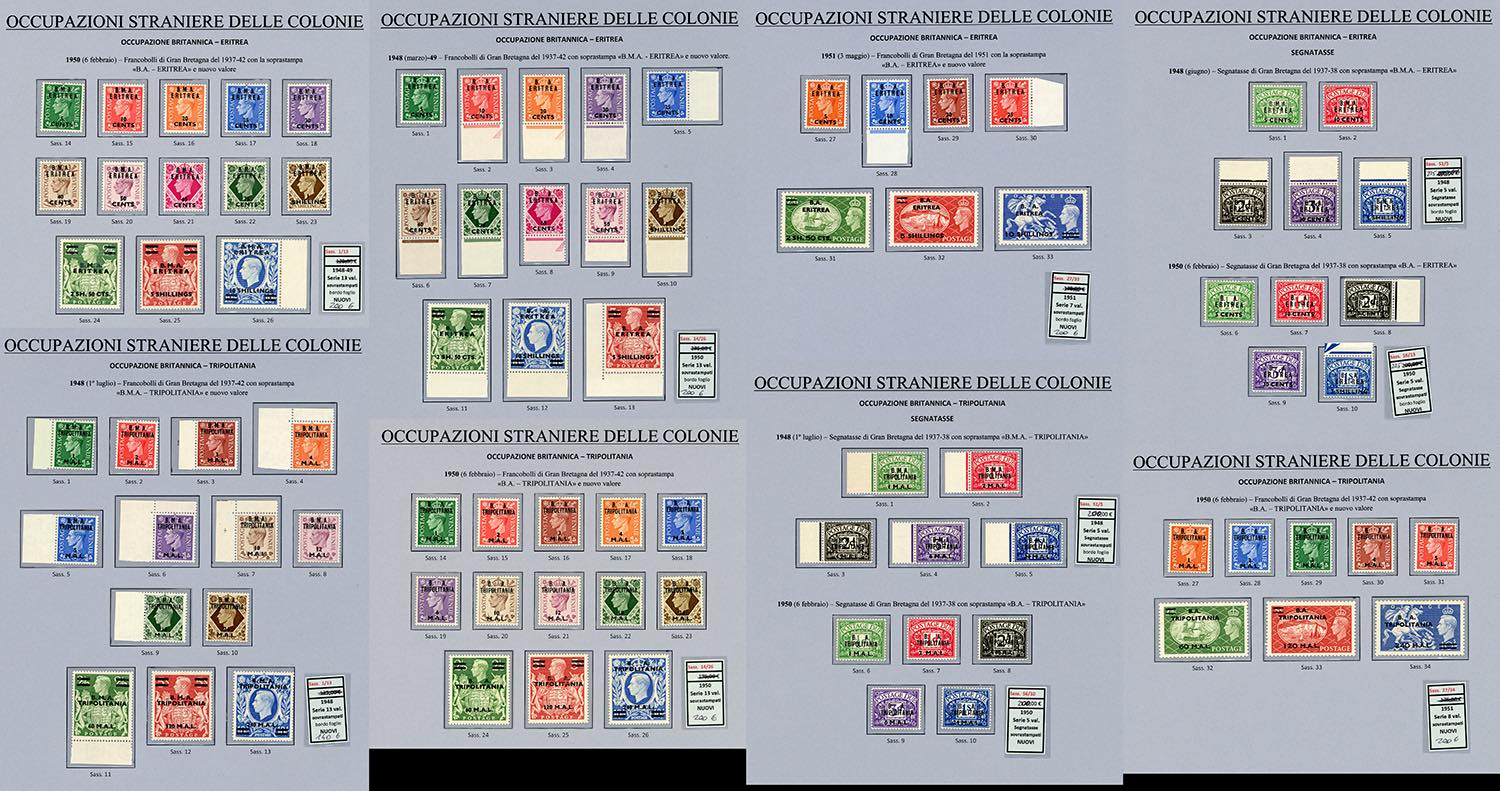 OCCUPAZIONE BRITANNICA 1948/1951 - Le tre emissioni dell'occupazione dell'Eritrea con segnatasse (1/13,14/26,27/33,Tax1/5,6/10), e le tre emissioni dell'occupazione della Tripolitania con segnatasse (1/13,14/26,27/34,Tax1/5,6/10), nuovi, gomma originale integra, perfetti. Molto belli e montati in pagine d'album.