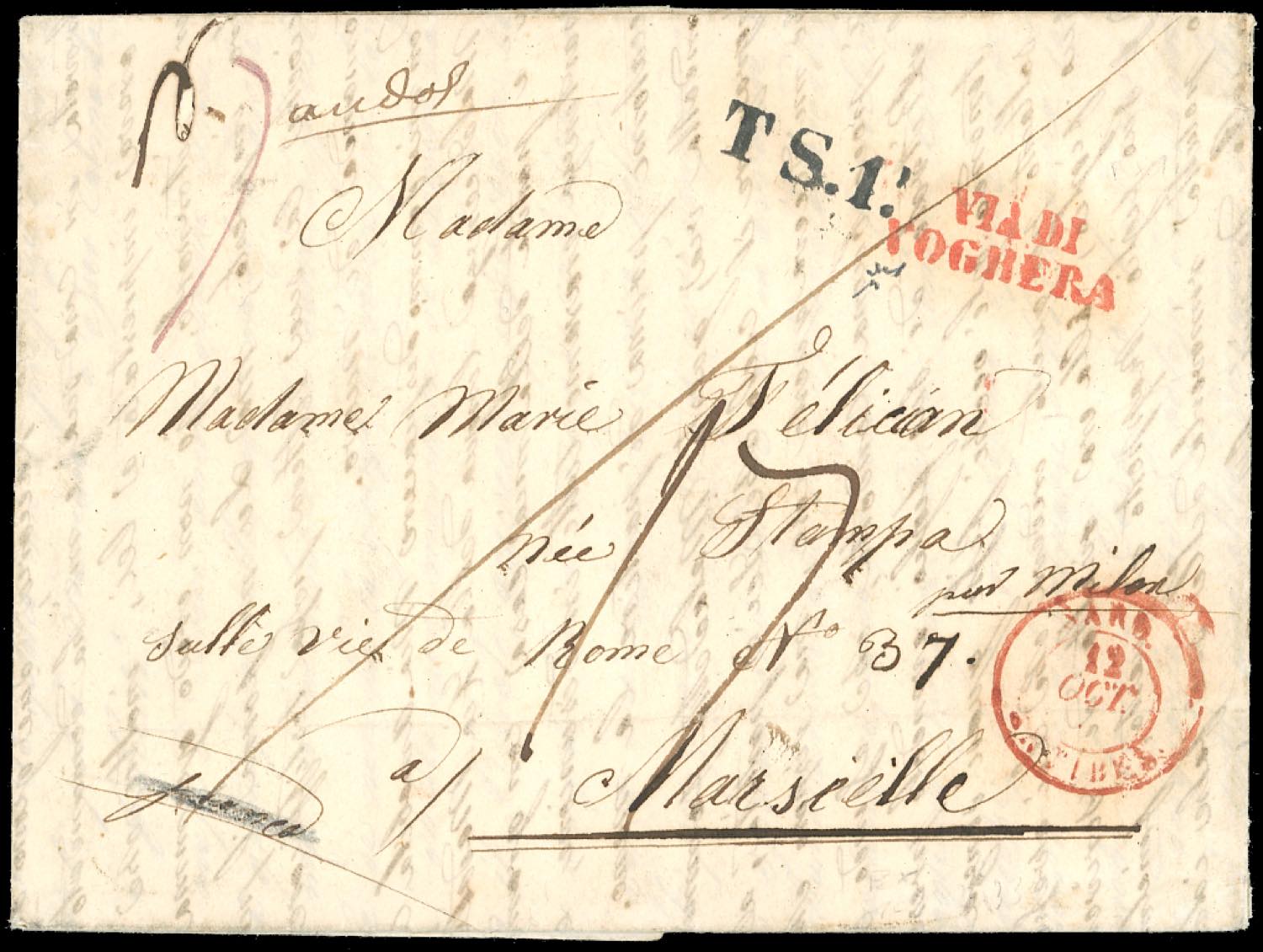 1840 - Lettera prefilatelica da Chiavenna 8/10/1840, datario di partenza al verso, a Marsiglia, tassata 17 decimi, lineare di transito "via di Voghera" in rosso e bollo TS1 (transito sardo I raggio) in nero. Non comune. Chiavarello. Ex coll. Imperato.