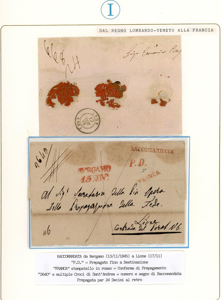 1845 - Lettera prefilatelica raccomandata franca a destino da Bergamo 13/11/1845 a Lione, bolli "franca", PD e "raccomandata" in rosso. Al verso il conteggio della tassa prepagata di 24 carantani. Rara. Chiavarello. Ex coll. Imperato.