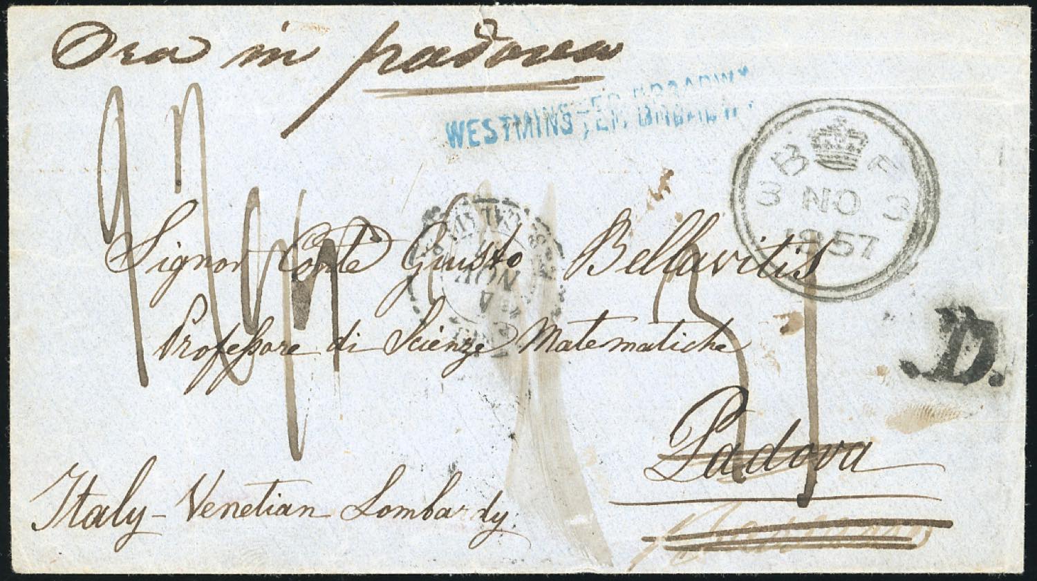INCOMING MAIL GRAN BRETAGNA 1857 - Busta non affrancata dalla Gran Bretagna 3/11/1857 a Padova, rispedita a Bassano e poi ancora a Padova, numerosi segni di tassa sul fronte. Interessante e non comune doppia rispedizione proveniente dall'estero.