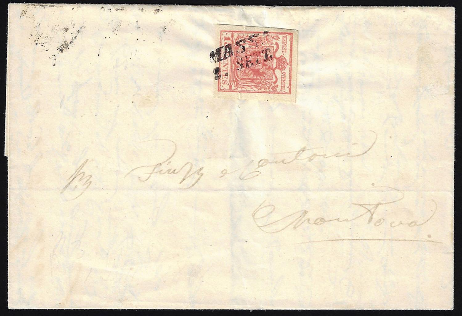 1854 - 15 cent. rosso carminio, III tipo, carta a macchina (6i), plì d'accordeon, perfetto, su lettera da Massa 2/9/1854 a Mantova. Bella.
