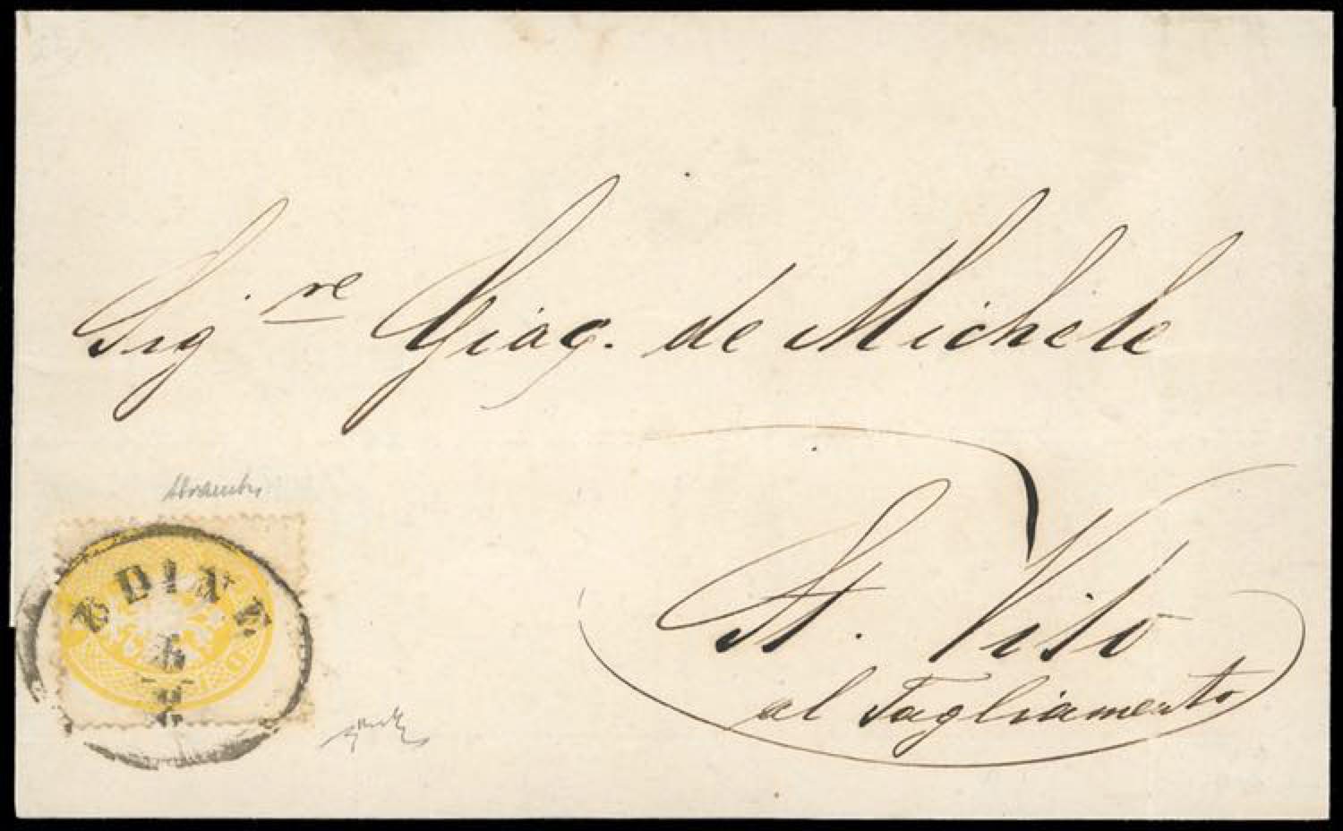 1863 - 2 soldi giallo, dent. 14 (36), perfetto, isolato su sovracoperta di circolare da Udine 6/8 a S.Vito al Tagliamento. Chiavarello.