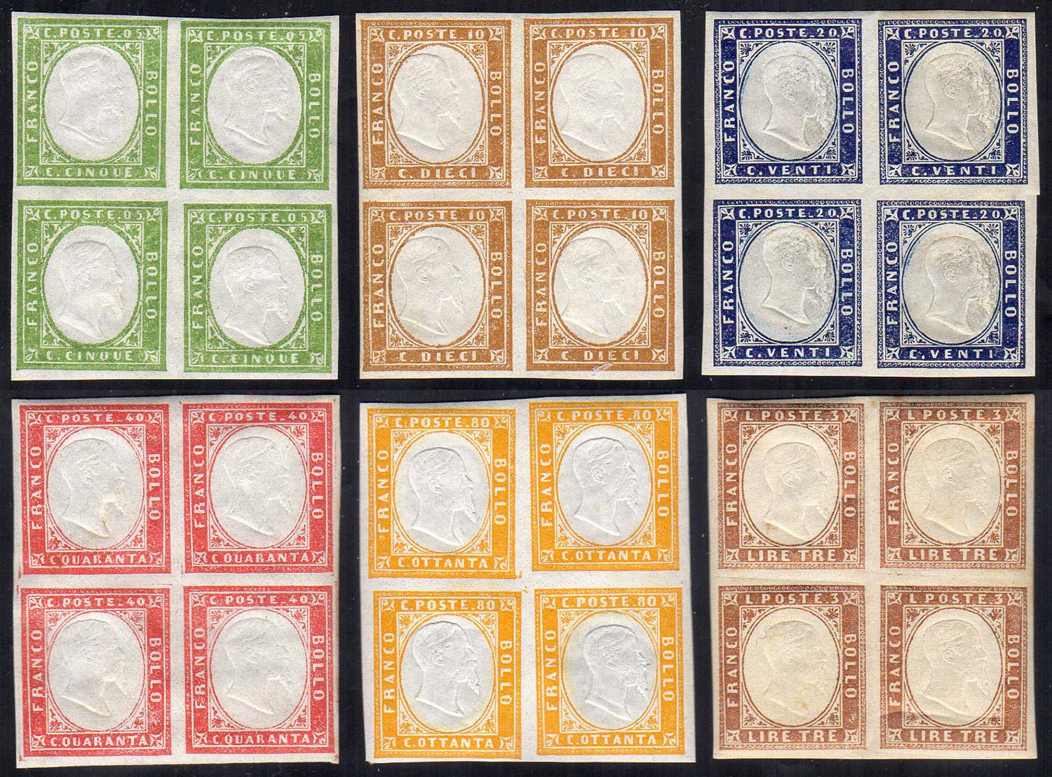 1855/63 - IV emissione, serie completa nelle tonalità più comuni (13E,14E,15E,16F,17D,18), blocchi di quattro, gomma originale, integra per gli esemplari inferiori, perfetti. Belli! Cert. Sorani per il 3 lire.