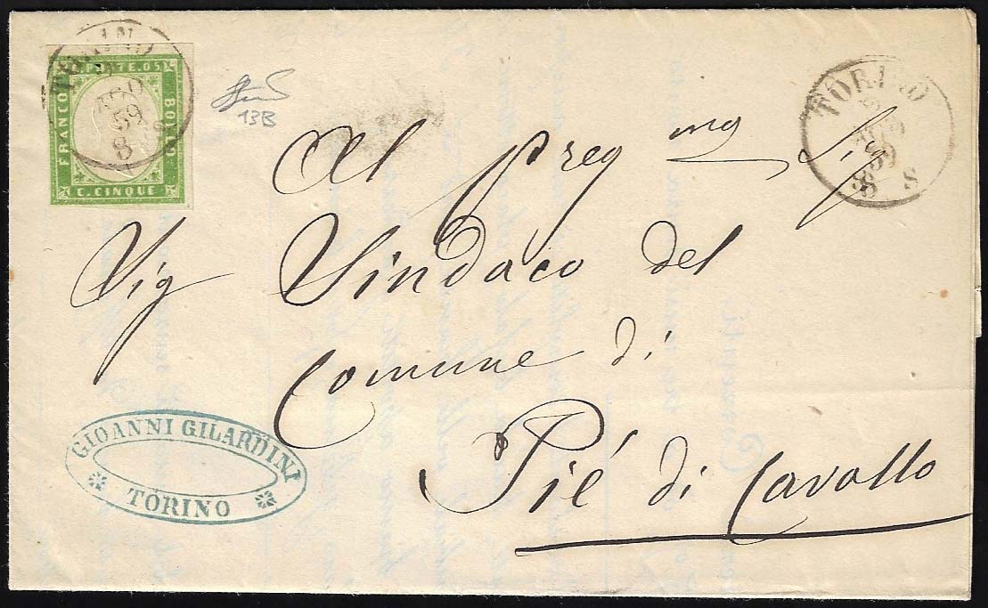 1859 - 5 cent. verde giallo brillante (13B), perfetto, isolato su circolare da Torino 2/8/1859 a Piè di Cavallo. Ferrario.