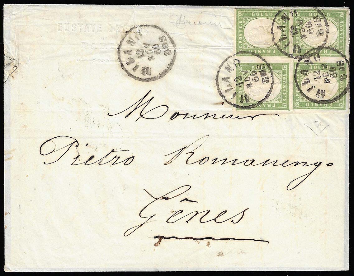 1860 - 5 cent. verde oliva (13Bc), blocco di quattro, perfetto, su busta da Milano 12/11/1860 a Genova. Molto rara! E.Diena, Grioni, cert. Oro Raybaudi.