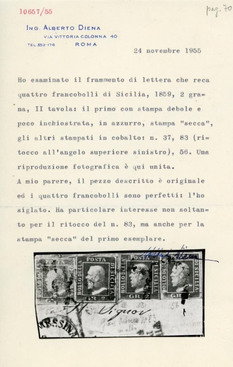 1859 - 2 grana cobalto, tre esemplari pos. 37, 56 e ritocco 83, 2 grana azzurro, stampa secca, tutti II tavola (7b,7), perfetti, su ampio frammento di lettera, in parte ricomposto, da Messina luglio 1860 a Genova. Insieme UNICO in periodo di uso tollerato a Messina. Cert. A.Diena.