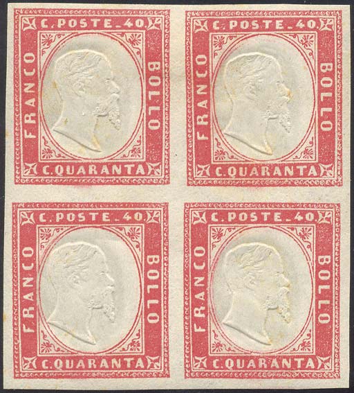 1862 - 40 cent. rosa carminio (16E), blocco di quattro, gomma originale, integra per due esemplari, perfetto. Ferrario.