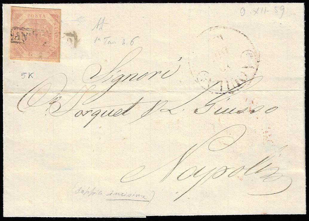 AQUILA, annullato + cerchio nero punti 11 - 2 grana, I tavola, doppia incisione, pos. 6 (5k), perfetto, su lettera del 10/12/1859 per ... Leggi tutto