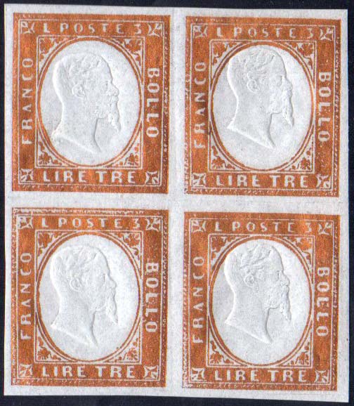 1861 - 3 lire rame vivo (18A), blocco di quattro, gomma integra, perfetto. Bello. Ferrario, cert. Finanziario Bolaffi del blocco di provenienza.