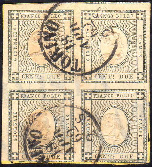 1861 - 2 cent. grigio verdastro (20b), blocco di quattro, intaccato in basso, usato a Torino 18/4/1862.