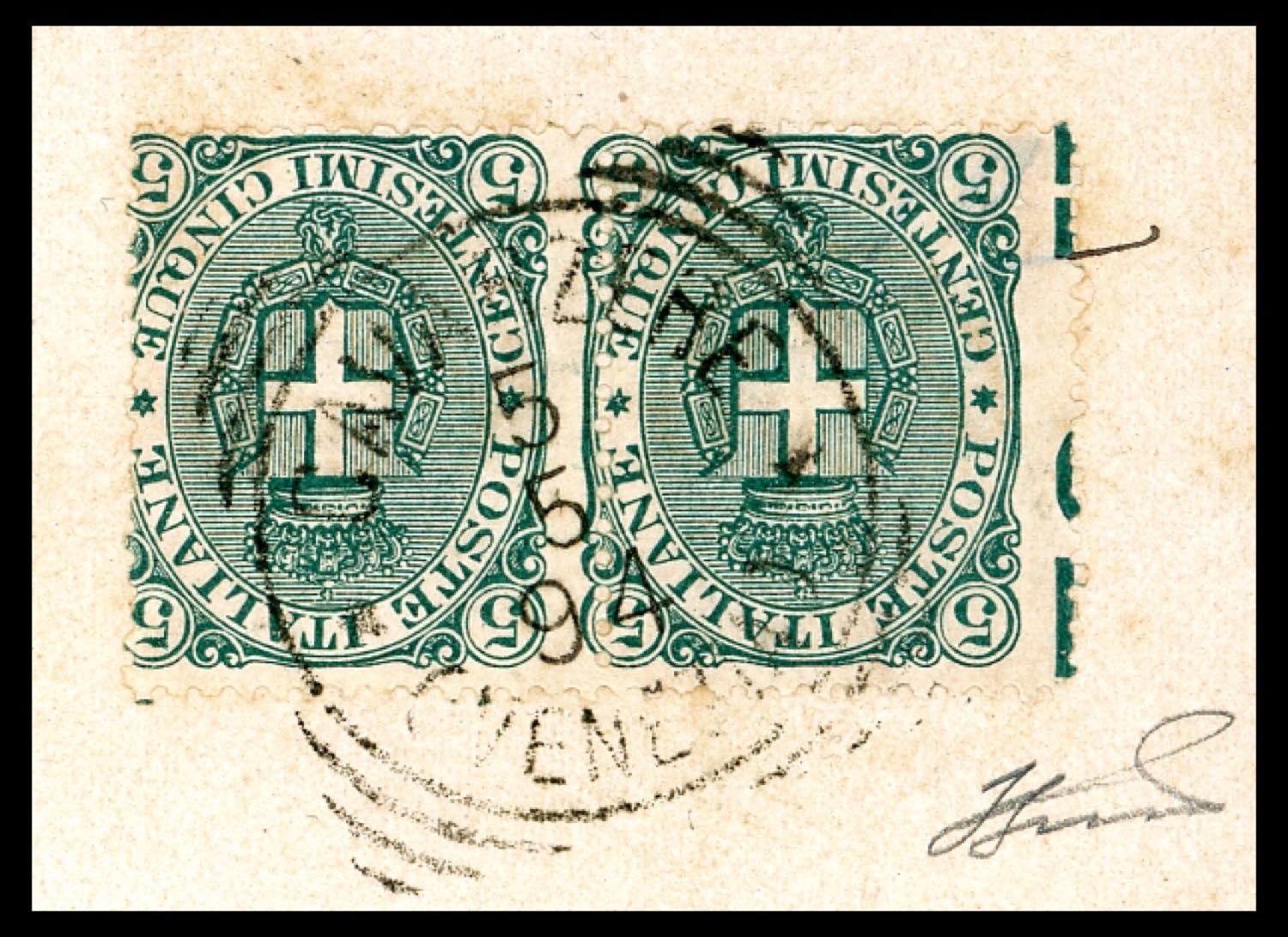 1894 - 5 cent. verde Stemma, coppia orizzontale con dentellatura verticale fortemente spostata a sinistra, il primo esemplare con parte ... Leggi tutto