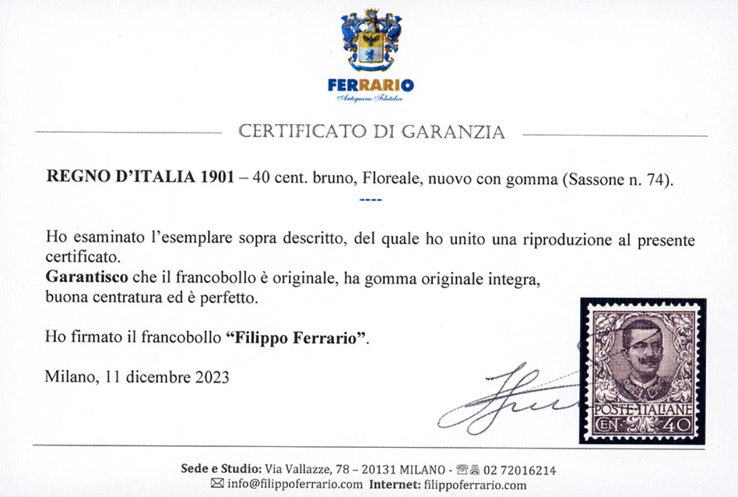 1901 - 40 cent. Floreale (74), ben centrato, gomma originale integra, perfetto e molto fresco. A.Diena, Raybaudi, cert. Ferrario.