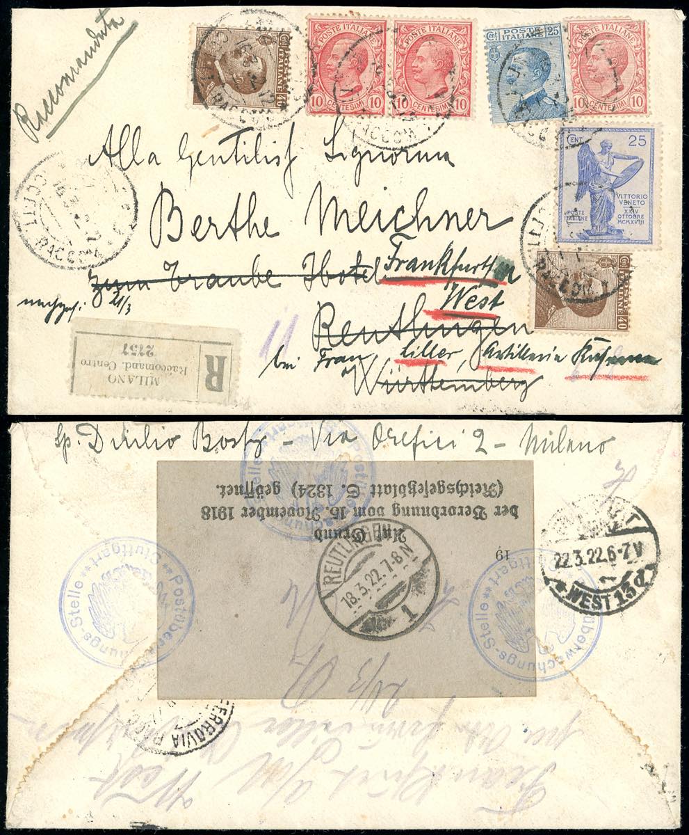 1922 - 10 cent. Leoni, tre esemplari, 25 cent. e 40 cent., due esemplari, Michetti, 25 cent. Vittoria (82,83,84,122), tutti perfetti ad eccezione di un 10 cent., su busta raccomandata da Milano 16/3/1922 per la Germania, rispedita, al verso fascetta di censura. Interessante, anche per la presenza di valori gemelli.