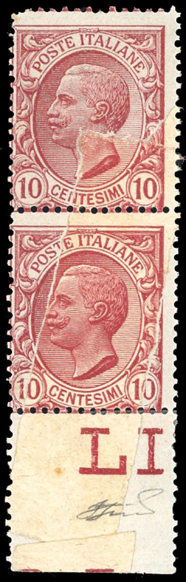 1906 - 10 cent. Leoni, coppia verticale, entrambi gli esemplari stampati su carta ricongiunta (82mc), bordo di foglio, gomma originale ... Leggi tutto