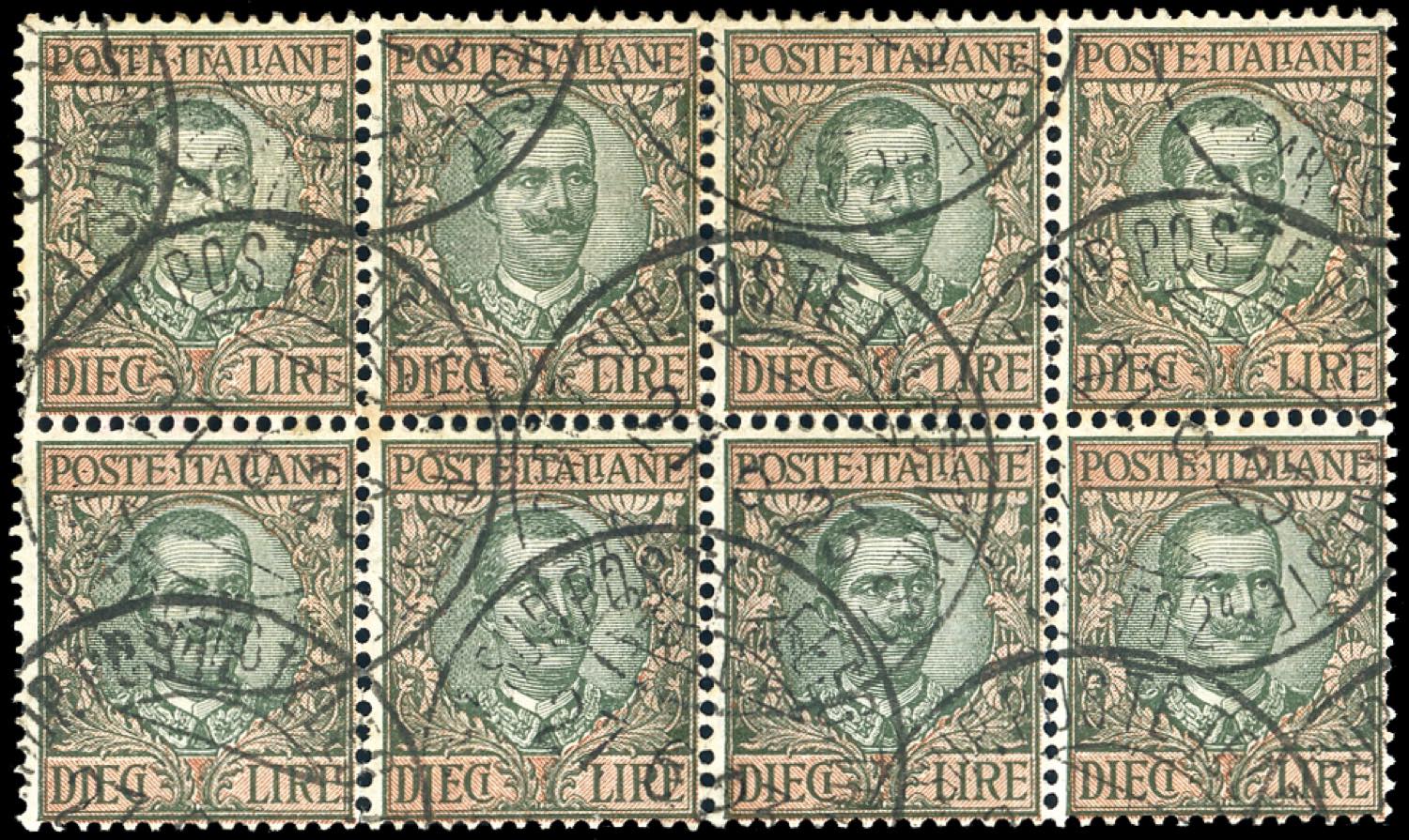 1910 - 10 lire Floreale (91), blocco di otto esemplari, perfetto, usato a Trieste 27/671923. Ferrario.