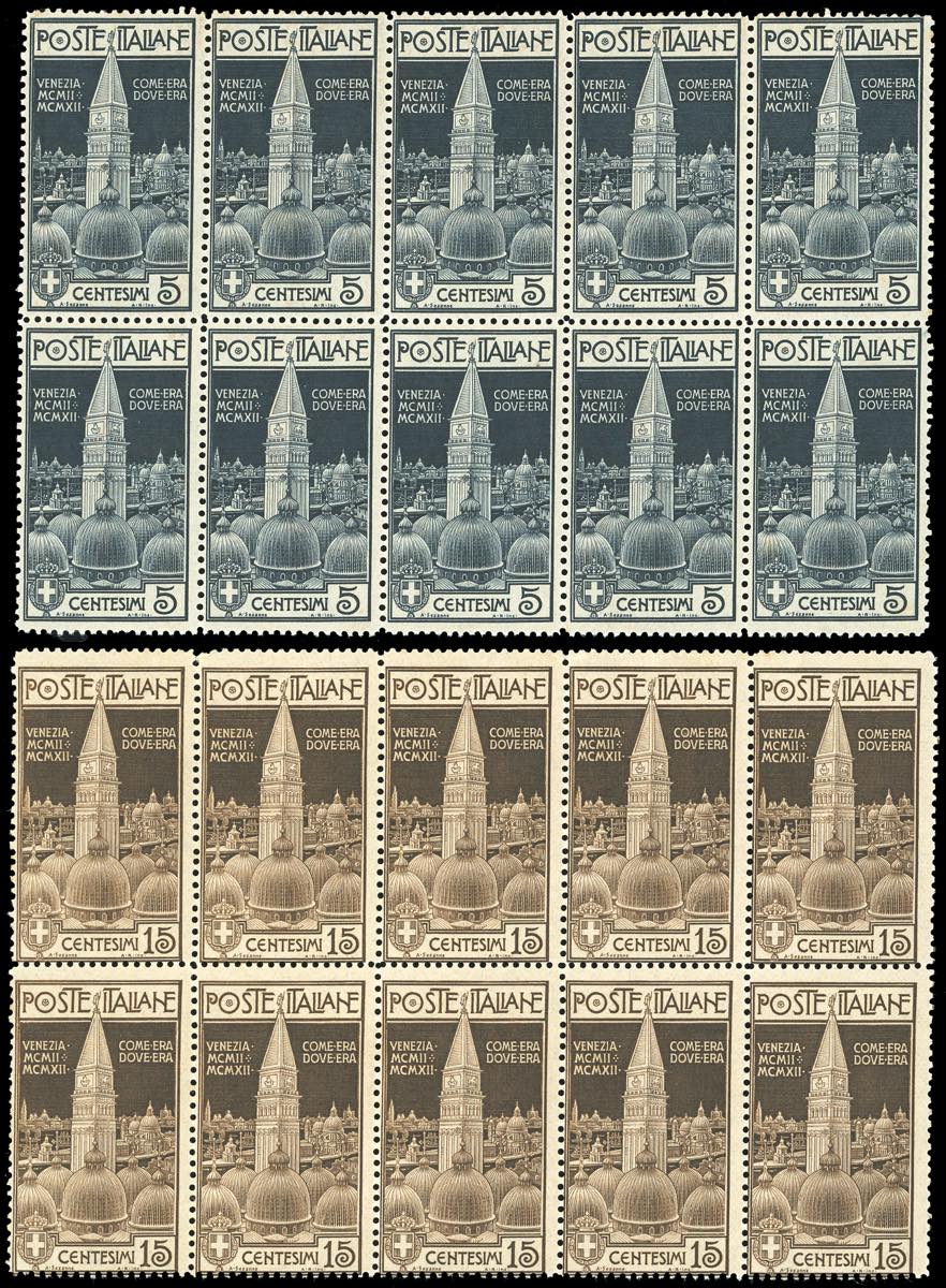 1912 - Campanile di Venezia, serie complete (97/98), blocchi di 10 esemplari, gomma originale integra, perfetti e molto freschi. Ferrario.