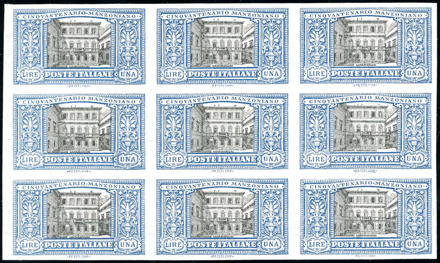 Lotto 1300 - 1923 - 1 lira Manzoni, non dentellato (155d), blocco di 9, ...