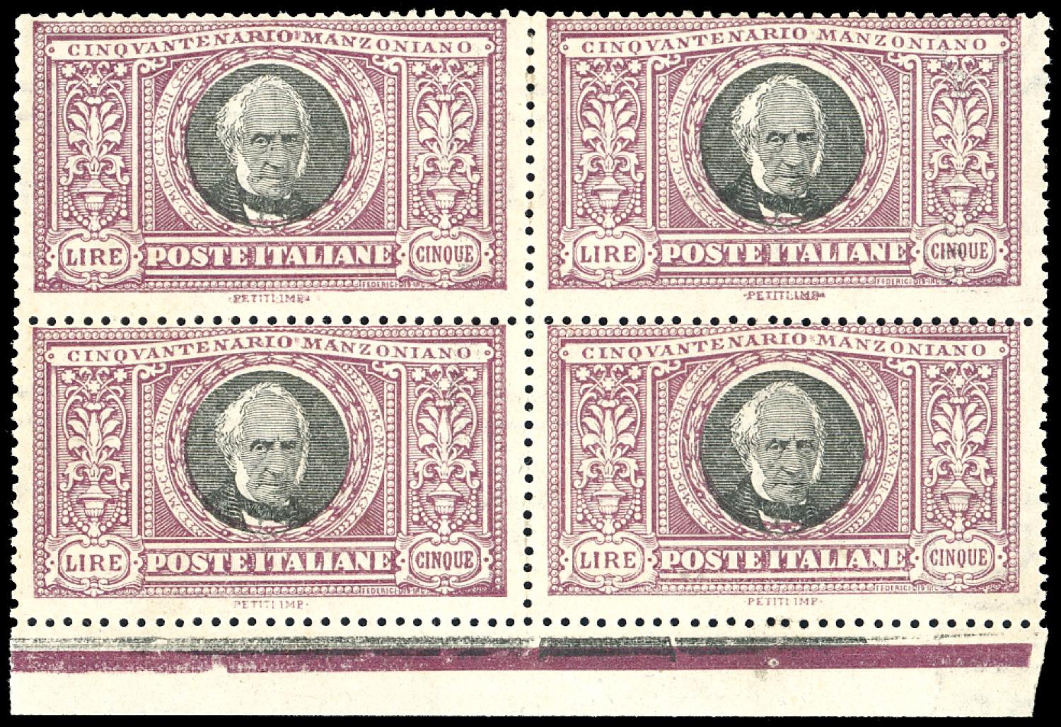 Lotto 1303 - 1923 - 5 lire Manzoni (156), blocco di quattro, bordo di ...