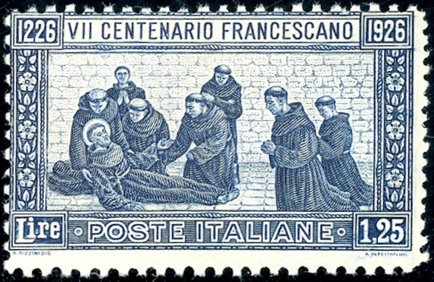 1926 - 1,25 lire San Francesco, dent. 11 da 3 lati x 13 1/2 (199a), nuovo, gomma originale integra, lieve grinza diagonale al verso. Raro, esistono solo 10 esemplari di tale varietà. Fotocopia cert. Raybaudi della striscia di provenienza. Firmato Chiavarello, Raybaudi.