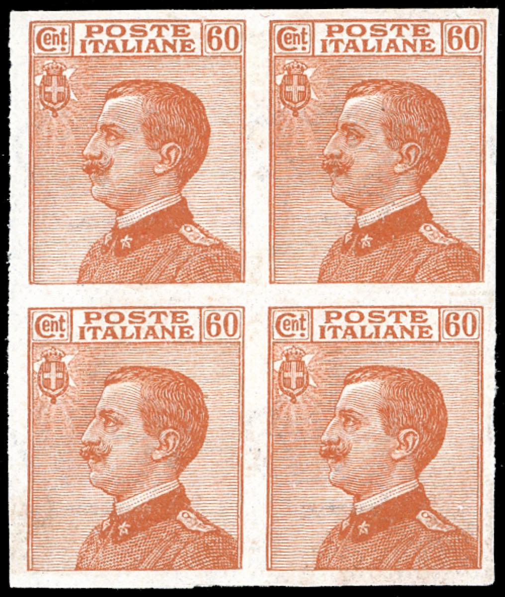 1926 - 60 cent. giallo bruno Michetti, non dentellato (205aa), blocco di 4, gomma originale, integra per i due esemplari inferiori, perfetto. Molto fresco. Em.Diena, Ferrario.