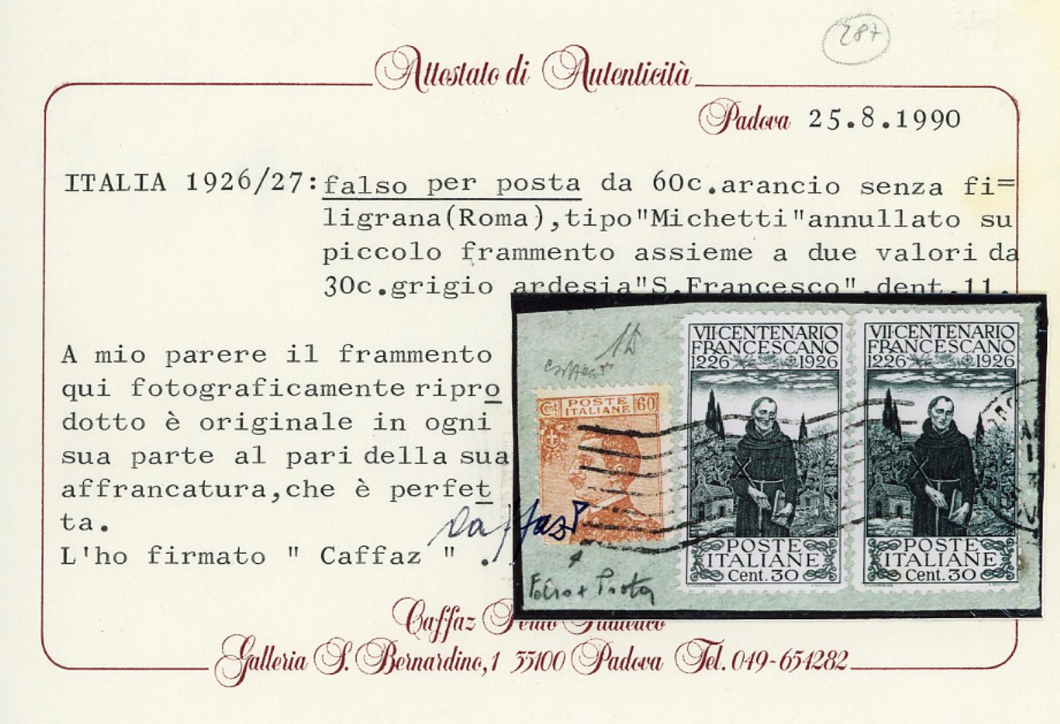 1927 - 60 cent. Michetti, falso per posta di Roma, 30 cent. S.Francesco, dent. 11 (F205,198), perfetti, usati su frammento. Uso molto raro, si conoscono solo due esemplari usati su frammento e due su busta di questo falso. A.Diena, cert. Caffaz.
