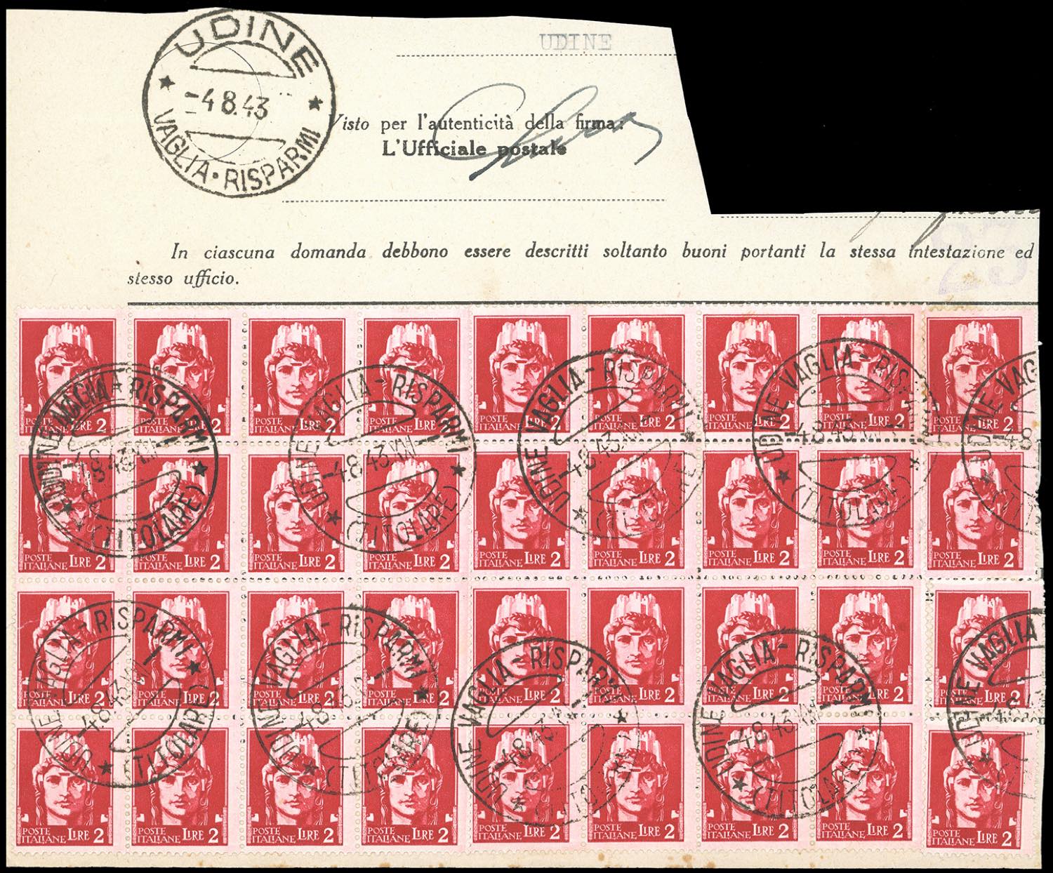 1943 - Due ampi frammenti di moduli di duplicazione di buoni postali fruttiferi, uno affrancato con blocco di 36 esemplari del 2 lire Imperiale (255), da Udine 4/8/1943, l'altro con 5 lire Imperiale, 20 esemplari (257), da Firenze 28/2/1944, in periodo di Repubblica Sociale Italiana.