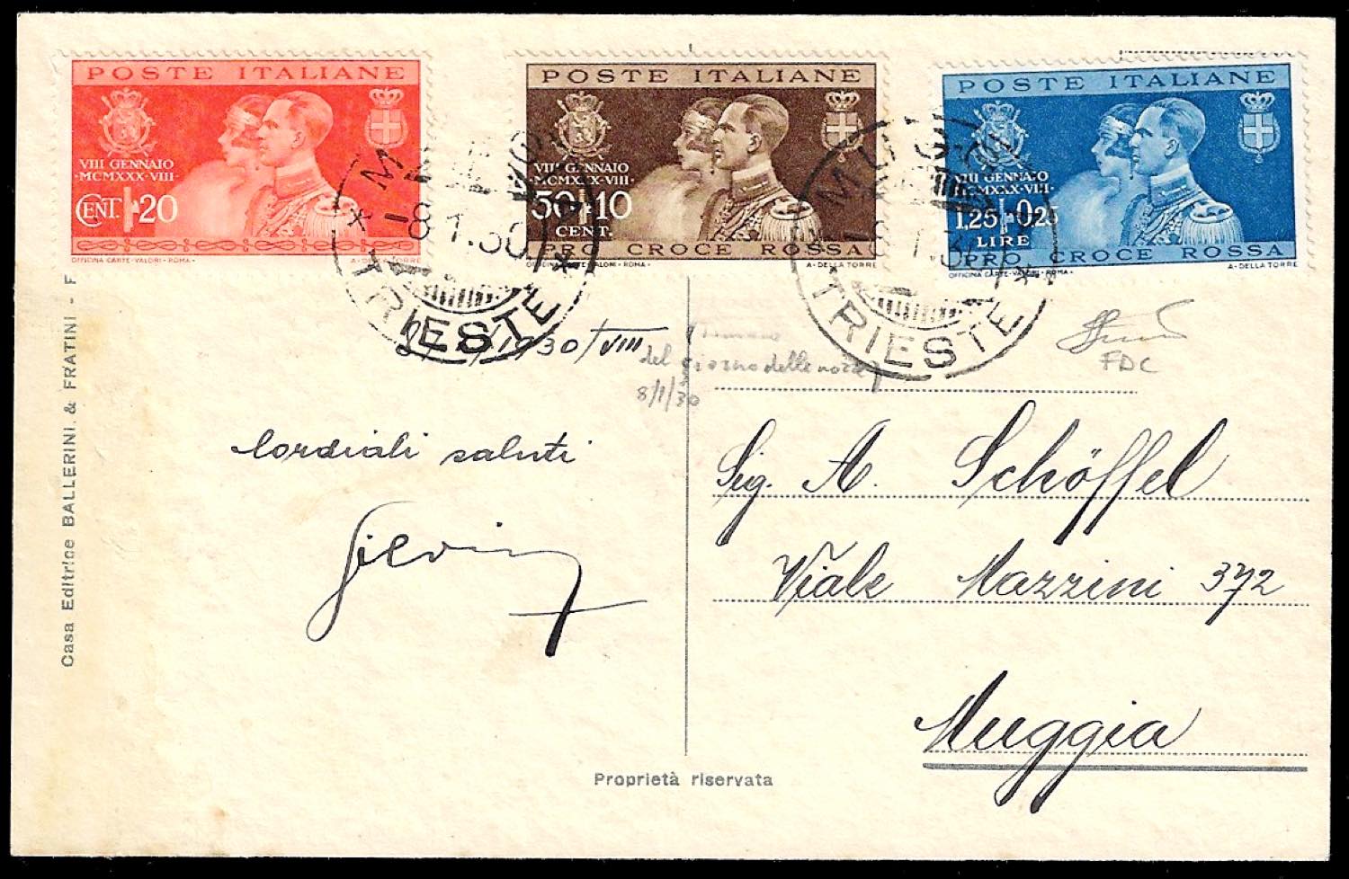 1930 - Nozze di Umberto, serie completa (269/271), perfetti, su cartolina da Muggia 8/1/1930, primo giorno d'emissione, per città. ... Leggi tutto
