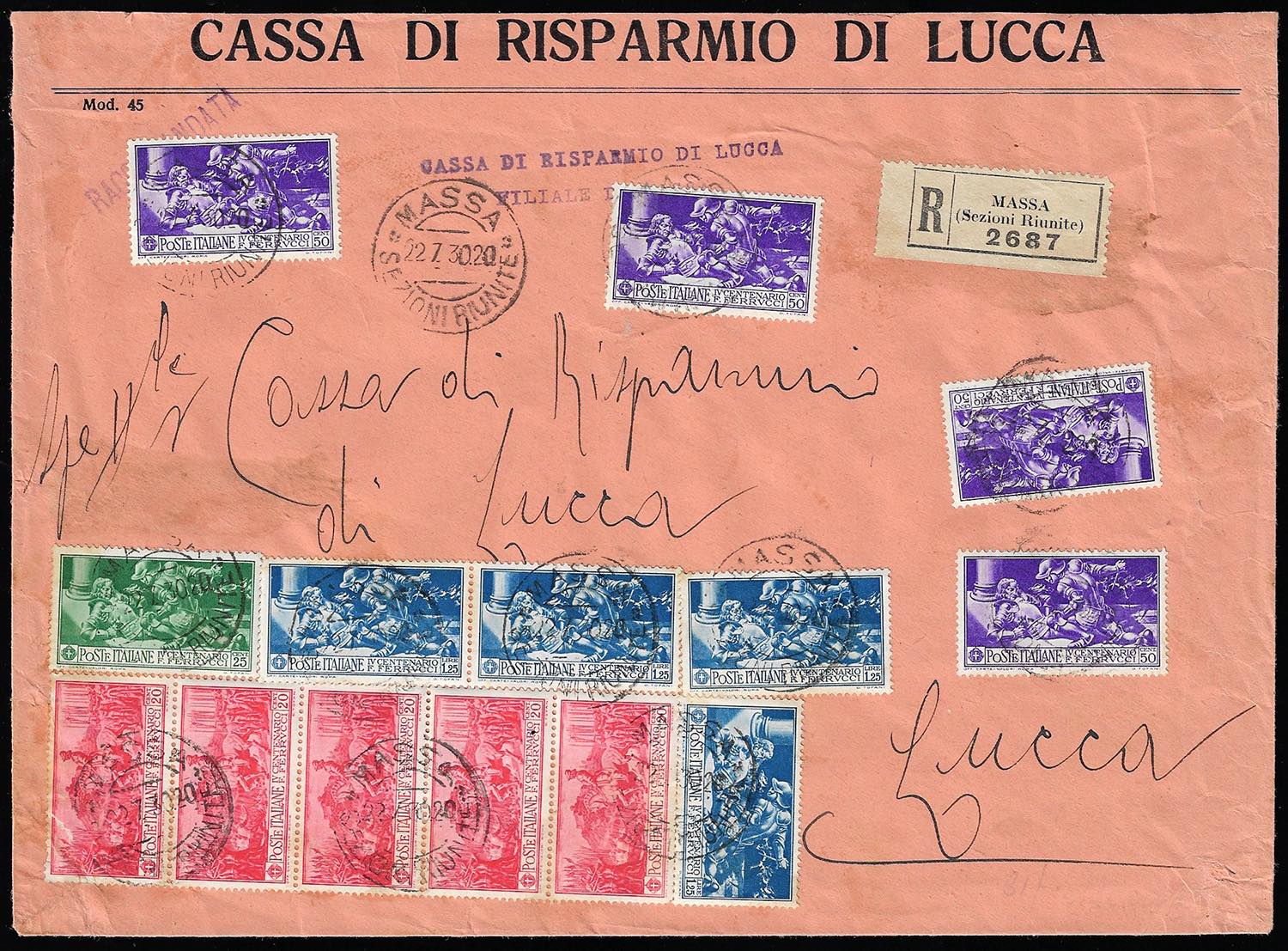1930 - 20 cent., striscia di cinque, 25 cent., 50 cent., quattro esemplari, 1,25 lire, quattro esemplari (276/279), lievi difetti su qualche esemplare, su busta raccomandata da Massa 22/7/1930 a Lucca.