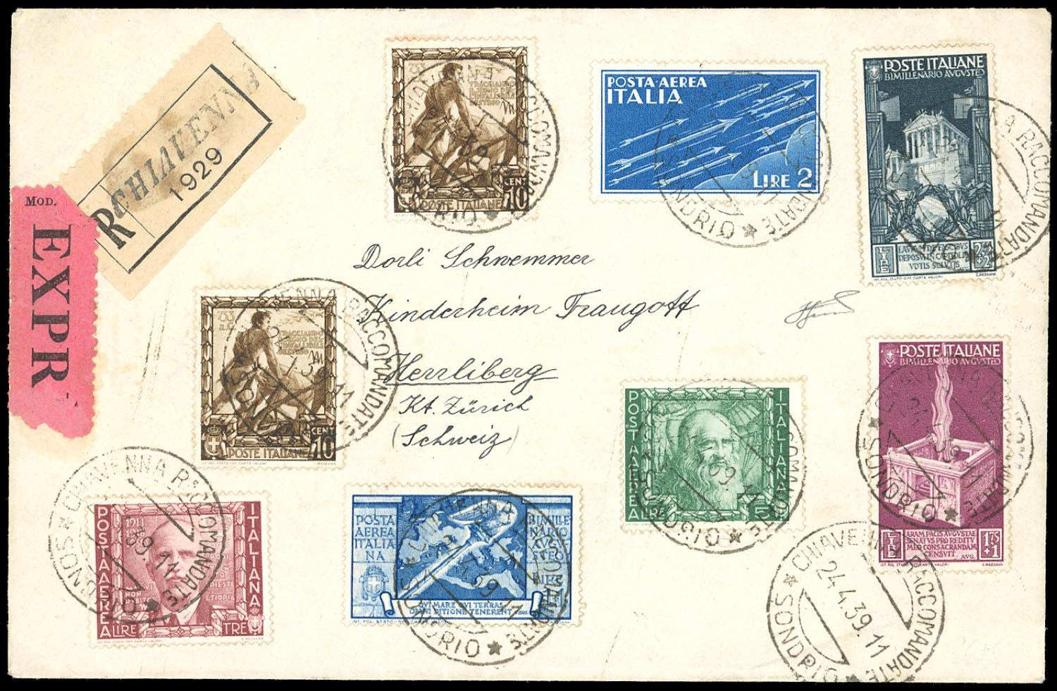 1939 - 1,75 + 1 lira, 2,55 + 2 lire posta ordinaria e 1+ 1 lira Augusto posta aerea, 3 e 5 lire Impero posta aerea e complementari (424,425,A109,439,A115,A116,A15), perfetti, su raccomandata espresso da Chiavenna 24/4/1939 per la Svizzera, bollo d'arrivo. Bella e rara affrancatura multipla con gli alti valori. Cert. Ferrario.