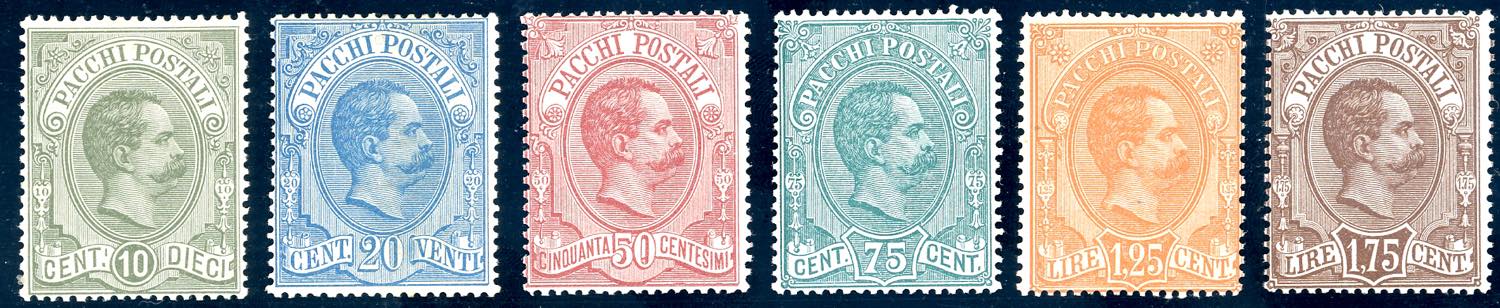 1884/86 - Umberto I, serie completa (1/6), discreta centratura, gomma originale, perfetti. Belli.