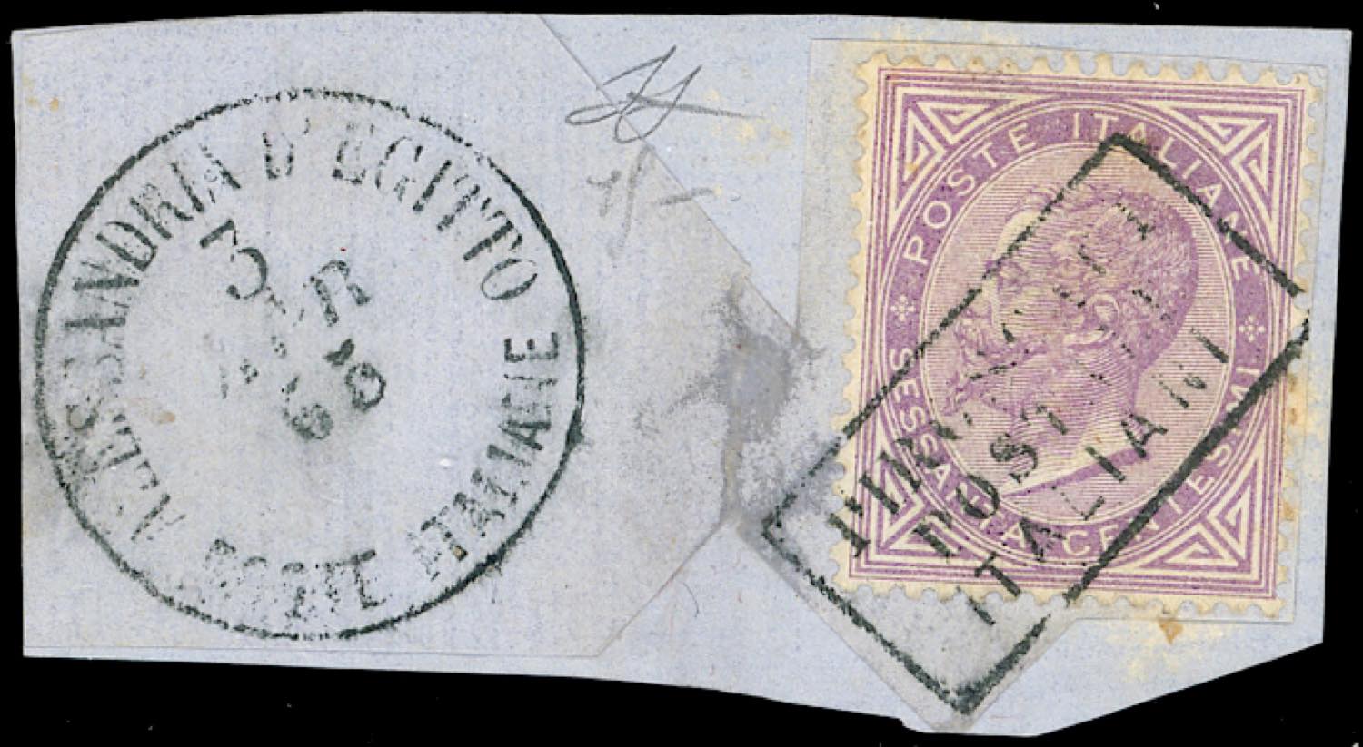 ALESSANDRIA D'EGITTO 1863 - 60 cent. De La Rue (Regno L21), ottimo stato, usato su frammento (in parte ricostruito) con il bollo in ... Leggi tutto