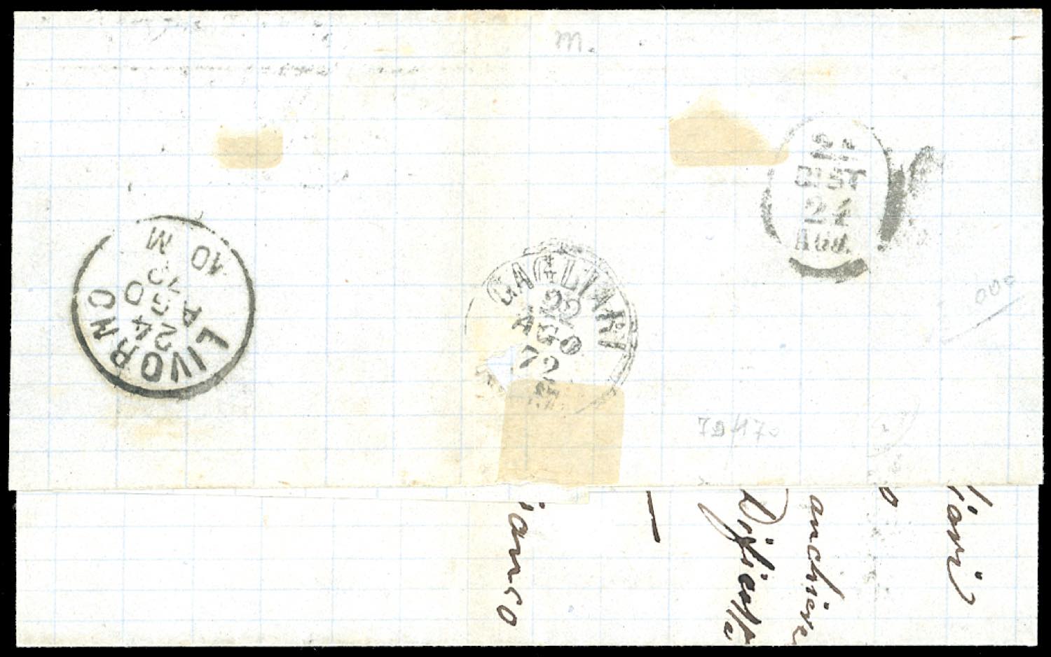 TUNISI 1872 - 40 cent. De La Rue (T20), perfetto, su lettera imbarcata direttamente sul battello da Tunisi a Livorno 24/8/1872, annullato ... Leggi tutto