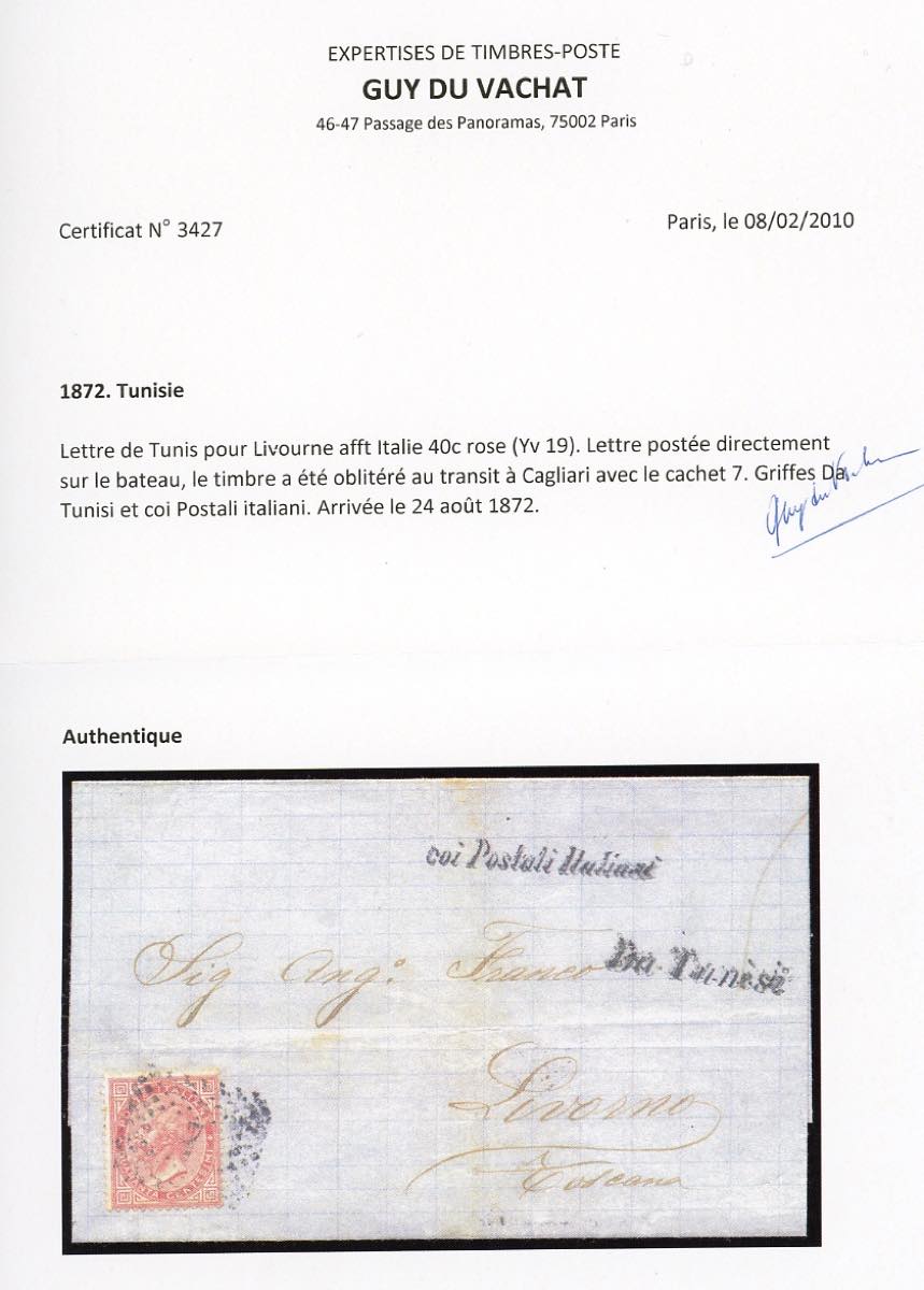 TUNISI 1872 - 40 cent. De La Rue (T20), perfetto, su lettera imbarcata direttamente sul battello da Tunisi a Livorno 24/8/1872, annullato in transito a Cagliari con il numerale a punti "7", lineari "Da Tunisi" e "Coi Postali Italiani". Insieme raro! Cert. Du Vachat.